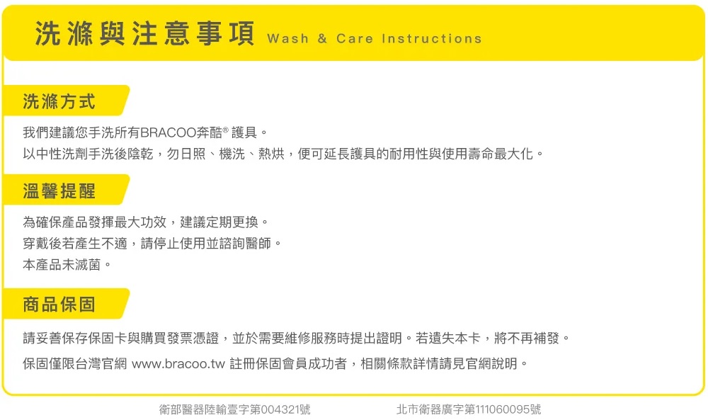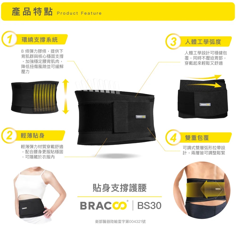 ●包覆型護腰 / 輕量級 / 3級支撐★●8條彈力膠條,提供下背肌群與核心堅固支撐●雙層調節設計,更服貼穩固,方便配合姿勢調整1、商品組合/規格:BRACOO奔酷腰部(S/M 黑) BS302、醫療器材許可證◆核定品名: "奔酷"軀幹裝具 (未滅菌)◆核准字號:衛部醫器陸輸壹登字第004321號◆藥商名稱:康璽國際有限公司◆製造廠名稱:COMFYSTONE CO., LTD◆製造廠地址:NORTH HEAD TANGLEI RD, INDUSTRIAL DEMOSTRATION AREA, RADAR SCIENCE & TECHNOLOGY ZONE, TANGGOU TOWN, SHUYANG COUNTY, SUQIAN CITY, JIANGSU PROVINCE 223611, CHINA3、藥商許可執照◆醫材許可執照字號:中市醫材販 字第 MD6203022382 號◆藥商名稱:佑全藥品股份有限公司◆藥商地址:台中市西屯區福和里台灣大道四段925號20樓之1◆諮詢專線電話:0800-046-111 / 0800-557-6884、製造日期:詳見商品包裝標示及說明5、有效期間或保存期限:詳見商品包裝標示及說明6、消費者使用前應詳閱醫療器材說明書 ◆ 注意事項1.產品彈性壓力及功能隨穿戴時間及頻率遞減,為確保產品效用達最大發揮,建議定期更換。2.穿戴後如有不適,請即停止使用並就醫診療。3.清潔用中性洗劑沖洗後風乾,請勿日照、熱烘。4.購買前請先檢查產品有無瑕疵;個人貼身用品,弄髒、毀損或洗滌過後,恕無法更換。 消費者使用前應詳閱醫療器材說明書