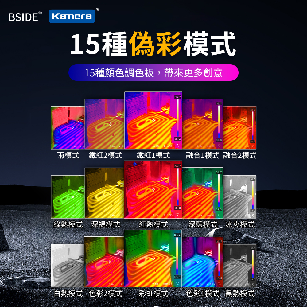 ● 15 種偽彩模式:內建多達 15 種熱成像偽彩模式,可根據不同應用選擇最適合的顯示方式,強化目標區域對比,提高分析判讀的準確性與效率。