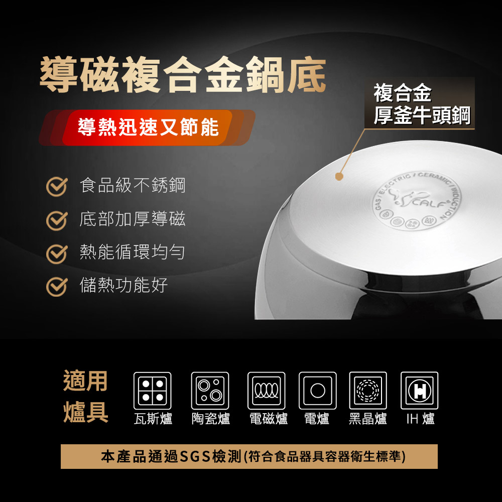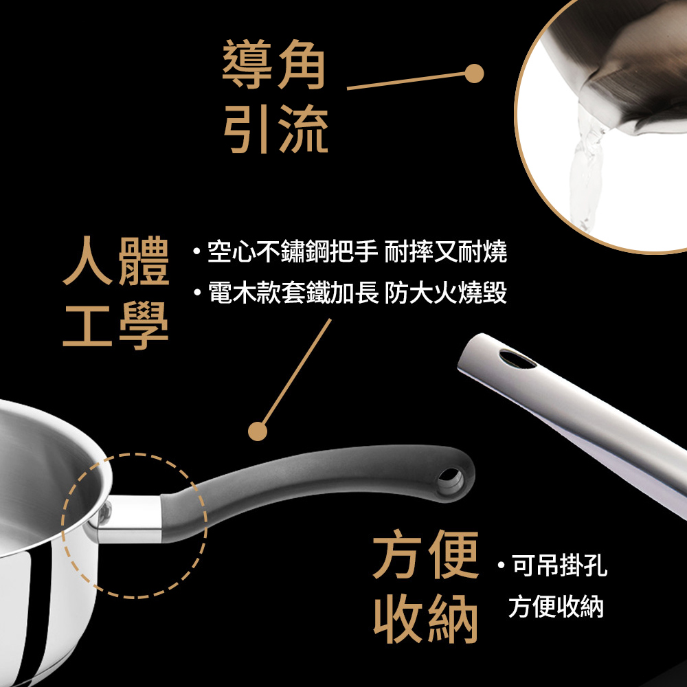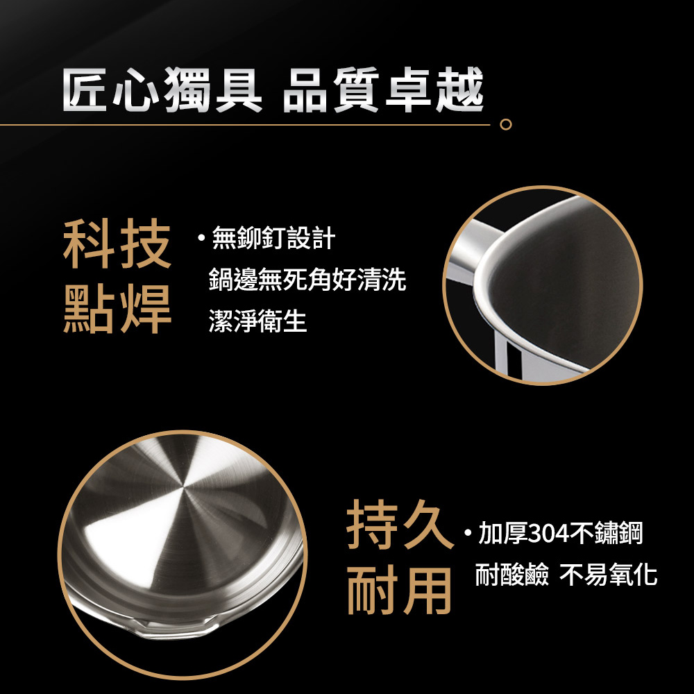 商品特色期間限定買就送法國進口清潔膏鍋底不易焦黑,加厚全包導磁複底聰穎導角設計,鍋邊不再外溢湯汁特殊防火圈,防止把手燒裂食品級不銹鋼 SGS檢驗通過材質:食品級304不鏽鋼把手:耐熱電木*產品皆為人工測量可能存在誤差,請以實際商品為主