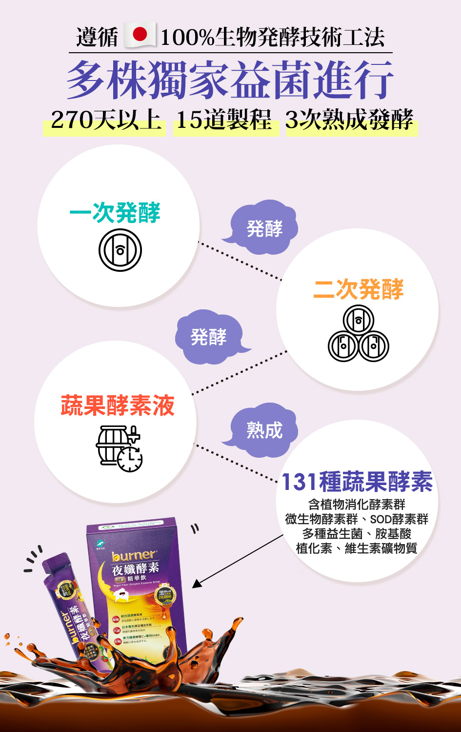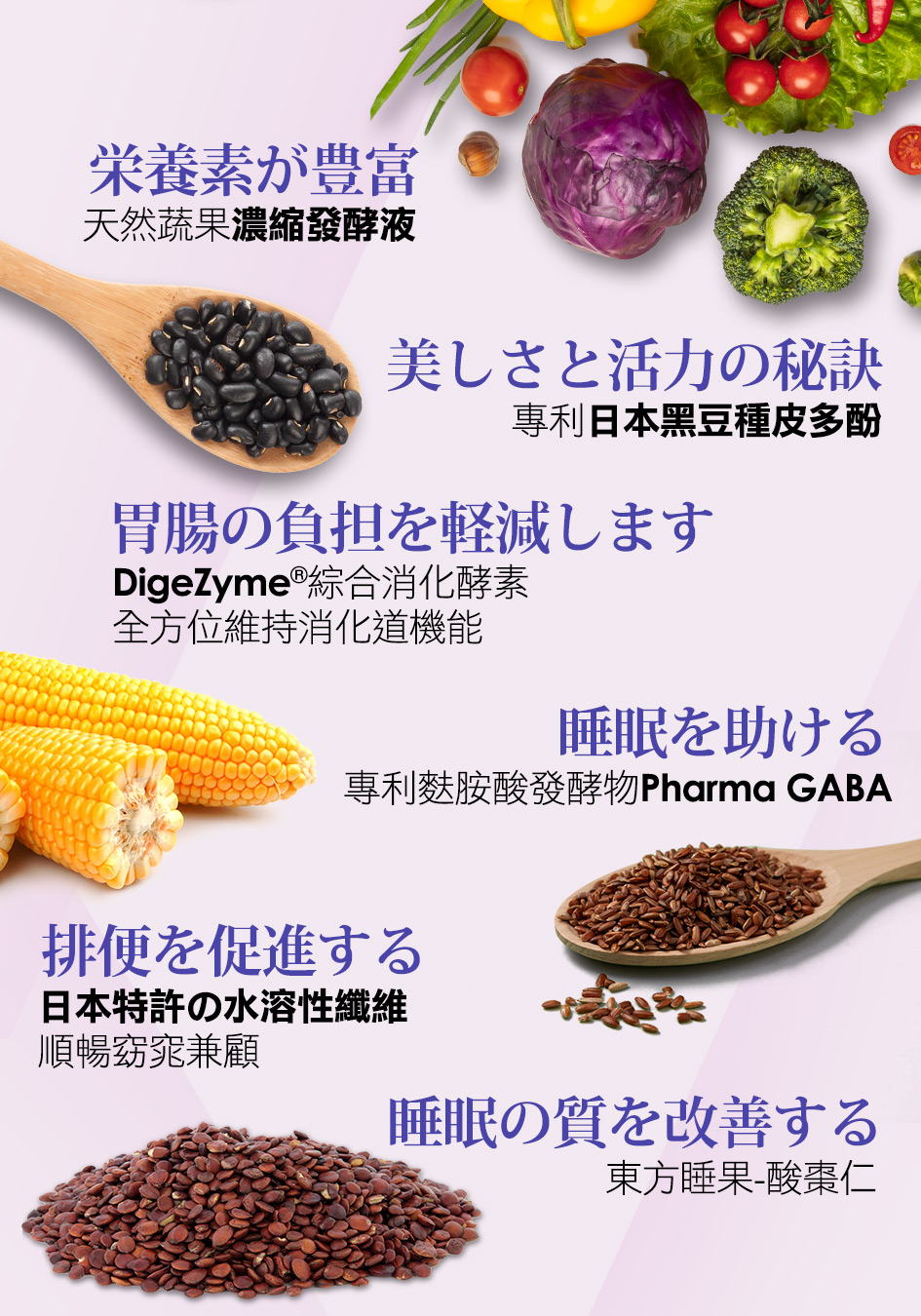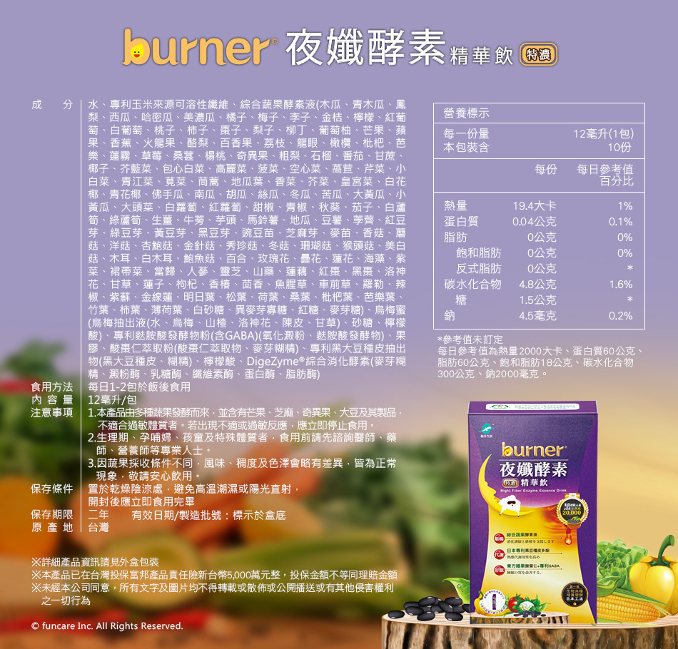 水、專利玉米來源可溶性纖維、綜合蔬果發酵液(木瓜、青木瓜、鳳梨、西瓜、哈密瓜、美濃瓜、橘子、梅子、李子、金桔、檸檬、紅葡萄、白葡萄、桃子、柿子、棗子、梨子、柳丁、葡萄柚、芒果、蘋果、香蕉、火龍果、酪梨、百香果、荔枝、龍眼、橄欖、枇杷、芭樂、蓮霧、草莓、桑葚、楊桃、奇異果、石榴、番茄、甘蔗、椰子、芥藍菜、包心白菜、高麗菜、菠菜、空心菜、萵苣、芹菜、小白菜、青江菜、莧菜、茼蒿、地瓜葉、香菜、芥菜、皇宮菜、白花椰、青花椰、佛手瓜、南瓜、胡瓜、絲瓜、冬瓜、苦瓜、大黃瓜、小黃瓜、大頭菜、白蘿蔔、紅蘿蔔、甜椒、青椒、秋葵、茄子、白蘆筍、綠蘆筍、生薑、牛蒡、芋頭、馬鈴薯、地瓜、豆薯、荸薺、紅豆芽、綠豆芽、黃豆芽、黑豆芽、豌豆苗、芝麻芽、麥苗、香菇、蘑菇、洋菇、杏鮑菇、金針菇、秀珍菇、冬菇、珊瑚菇、猴頭菇、美白菇、木耳、白木耳、鮑魚菇、百合、玫瑰花、曇花、蓮花、海藻、紫菜、裙帶菜、當歸、人蔘、靈芝、山藥、蓮藕、紅棗、黑棗、洛神花、甘草、蓮子、枸杞、香椿、茴香、魚腥草、車前草、羅勒、辣椒、紫蘇、金線蓮、明日葉、松葉、荷葉、桑葉、枇杷葉、芭樂葉、竹葉、柿葉、薄荷葉、白砂糖、異麥芽寡糖、紅糖、麥芽糖)、烏梅蜜(烏梅萃取液、砂糖、仙楂抽出液(山楂、甘草、洛神花、陳皮)、香料、檸檬酸、焦糖色素)、專利麩胺酸發酵物(含GABA)、果膠、酸棗仁萃取物、專利黑大豆種皮抽出物(黑大豆種皮、糊精)、檸檬酸、DigeZyme®綜合酵素(麥芽糊精、α-澱粉酶、乳糖酶、纖維酶、中性蛋白酶、脂肪酶)