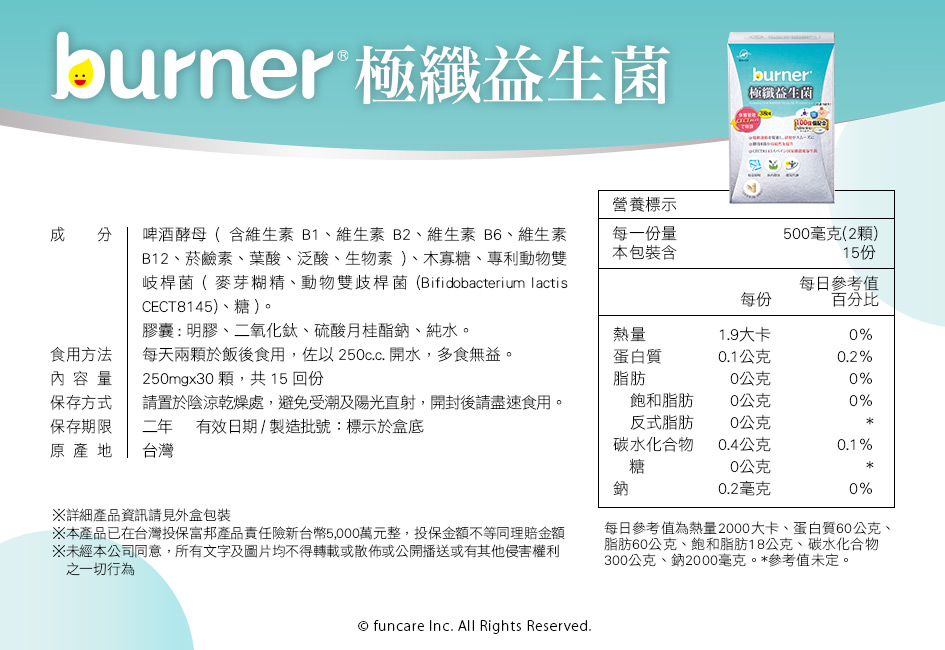 啤酒酵母(含維生素B1、維生素B2、維生素B6、維生素B12、菸鹼素、葉酸、泛酸、生物素)、木寡糖、專利乳酸菌(麥芽糊精、雙歧桿菌(Bifidobacterium lactis CECT8145)、糖) 膠囊: 明膠、二氧化鈦、硫酸月桂酯鈉、純水