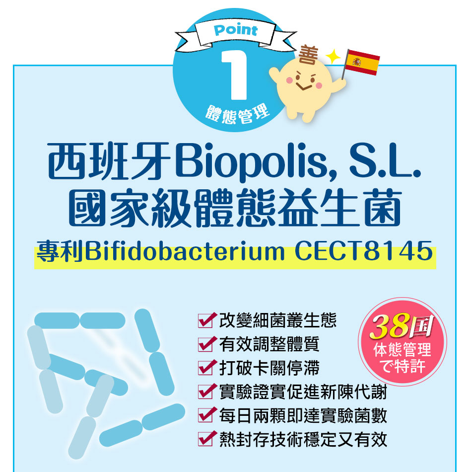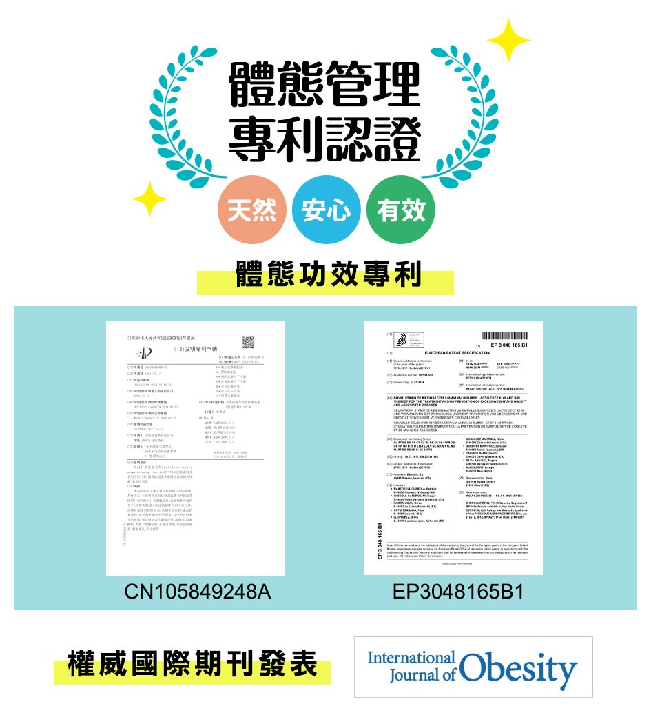 ●符合美國GRAS、歐盟QPS安全資格●雙體態管理專利+雙安全認證益生菌●體內環保x 能量代謝 x 輕盈順暢