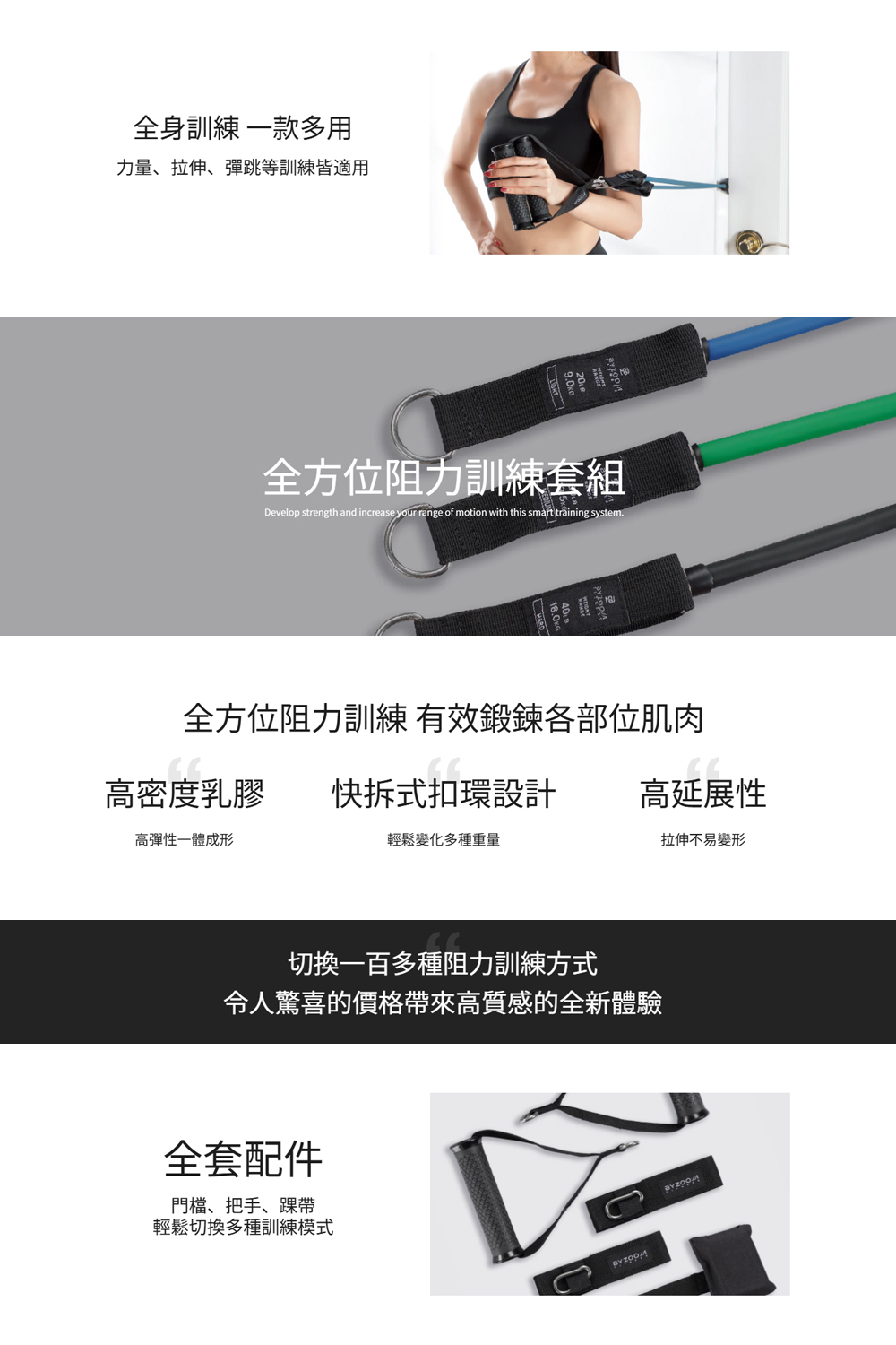 Byzoom Fitness全方位阻力訓練組是居家健身不可或缺及最完善的訓練工具,內含三種阻力強度的選擇,內附全套配件: 門檔、把手、踝帶,提供全方位訓練功能,居家訓練必備又有效的入門配件,隨時隨地可鍛鍊翹臀、核心肌群,告別手臂蝴蝶袖,增強肌耐力,並可加強訓練各部位肌肉,適用初階暖身至進階訓練。