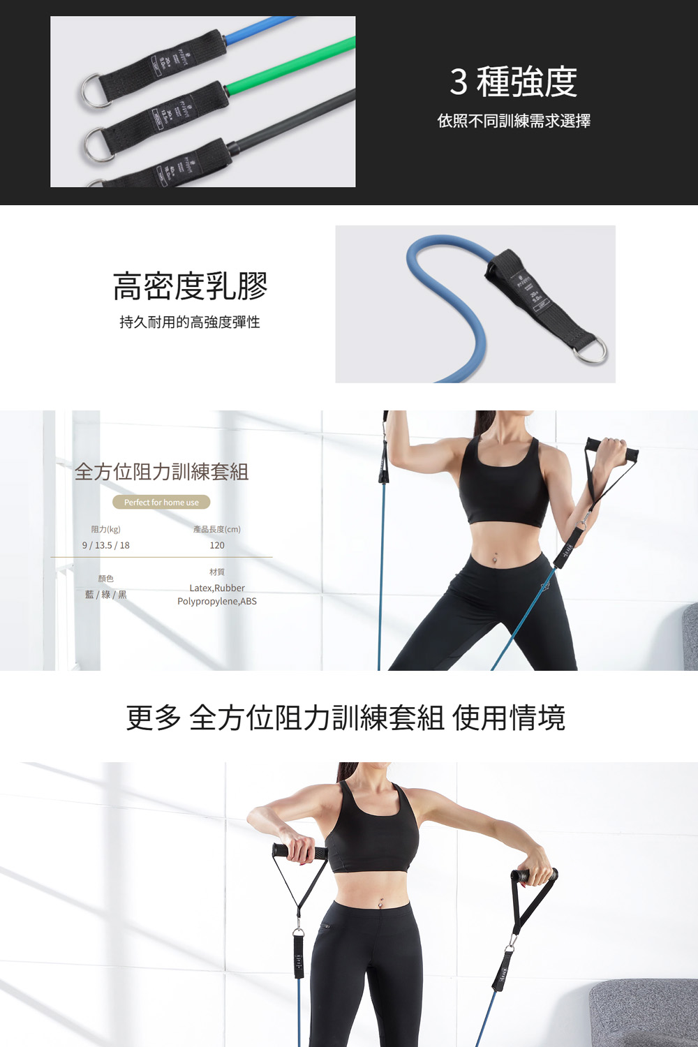 多達 3 種阻力強度:重 - 18 KG - 黑、中 - 13.5 KG - 綠、輕 - 9 KG - 藍 ,可從依照不同訓練需求選擇 ,可搭配額外 極重- 22.5 KG - 紅、極輕 - 4.5 KG - 黃 2 種阻力繩