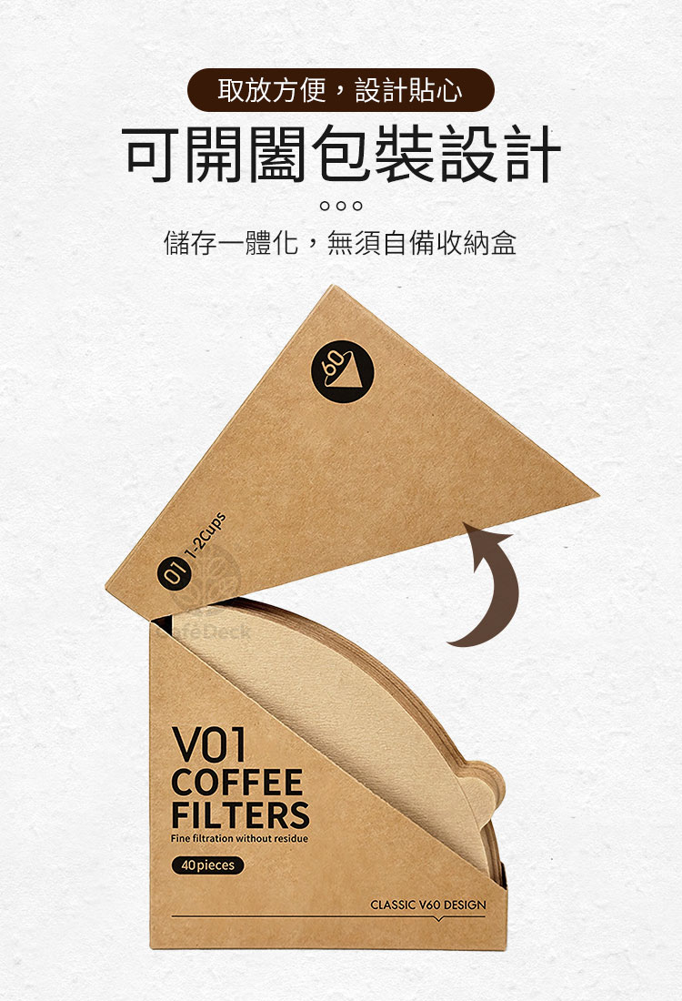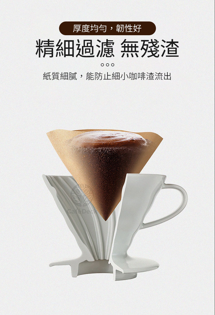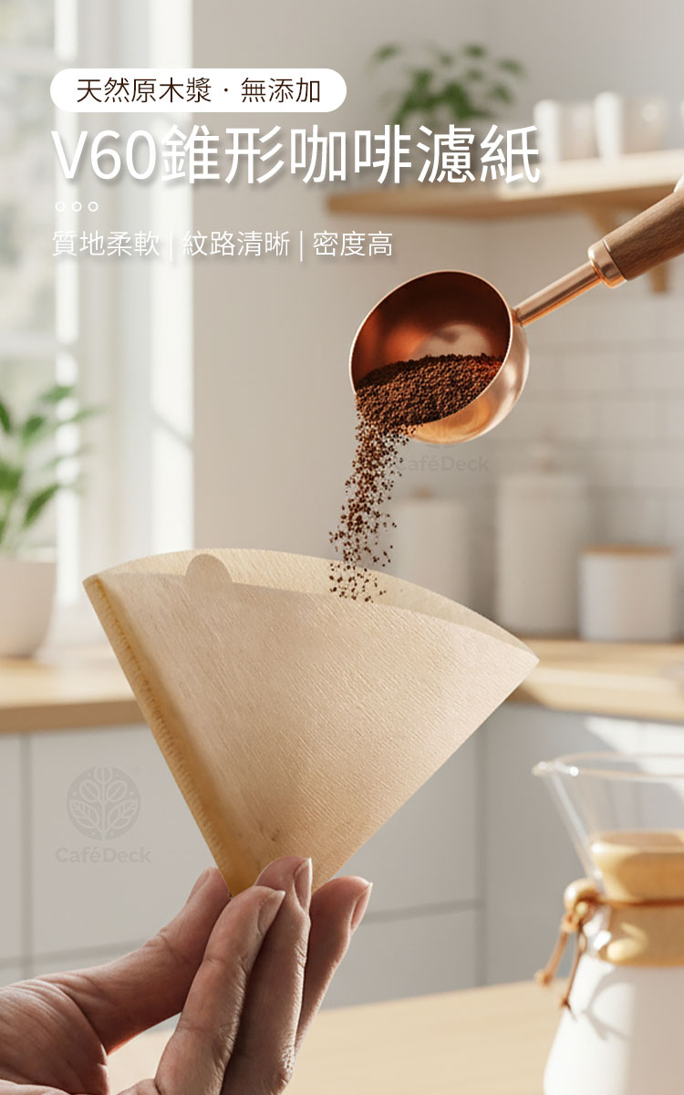 CaféDeck V60錐形原木漿咖啡濾紙|無漂白·高密度·手沖專用濾紙一杯乾淨的咖啡,從濾紙開始~ CaféDeck V60錐形原木漿咖啡濾紙,為講究純粹風味的你而生。採用天然原木漿製成、無漂白無添加,保留最真實的咖啡香氣,讓每一滴萃取都純淨如初。✅ 100%天然原木漿|柔軟韌性佳,不易破損✅ 無漂白無添加|無化學異味、口感更純粹✅ 經典V60錐形結構|延長水與咖啡粉接觸時間,萃取更均勻✅ 高密度濾層|有效過濾細粉,保留香氣不留雜質✅ 高溫壓邊技術|無接著劑、不因熱水鬆脫✅ 可開闔紙盒包裝|取放便利、收納整潔、質感滿分☕ 【使用方式】輕鬆四步沖出完美香氣1.將濾紙放入V60濾杯並以熱水潤濕2.倒入研磨好的咖啡粉3.注入約90°C熱水,靜置15秒悶蒸4.以繞圈方式注水至萃取完成,即可享受香濃咖啡💡 小提醒: 沖泡前可先潤濕濾紙,有助於去除木質氣味並預熱濾杯。🌸使用後你會發現~☕ 沖煮過程流速穩定,香氣自然釋放🌿 咖啡液乾淨透亮,無粉渣🏡 每一次手沖,都是家的儀式感💡 【適用對象】✔️ 手沖咖啡初學者✔️ 咖啡愛好者與居家沖煮族✔️ 注重純淨風味與濾紙材質安全的使用者☕ 一起用CaféDeck,沖出生活的美好香氣。#CaféDeck #手沖咖啡 #V60濾紙 #原木漿濾紙 #咖啡生活📣 FAQ (常見問答)Q1:這款濾紙有經過漂白嗎?A1:沒有。本產品使用100%天然原木漿,無漂白、無添加,安心沖煮不影響風味。Q2:是否適用於Hario V60濾杯?A2:是的!本品為V60錐形設計,可完美貼合Hario、KONO、Kalita等多品牌濾杯。Q3:濾紙尺寸有分嗎?A3:有,V01適用1~2杯,V02適用2~4杯,請依個人沖煮量選購。Q4:會有紙味影響咖啡嗎?A4:建議使用前以熱水預浸濾紙,可去除微量木漿氣味並預熱濾杯,風味更穩定。Q5:包裝是否方便收納?A5:「可開闔盒設計」,取用方便不散落,直接放置桌面也美觀。注意事項:1.使用前建議以熱水沖洗濾紙,可去除自然木漿味。2.請避免放置於潮濕或高溫環境。3.濾紙為一次性使用,請勿重複使用以免影響風味。4.請依濾杯尺寸選擇對應規格(V01或V02)。5.使用後請妥善丟棄並保持濾杯清潔,延長器具壽命。
