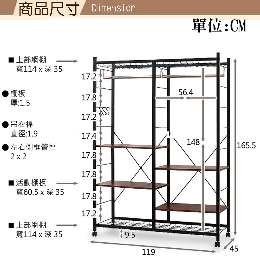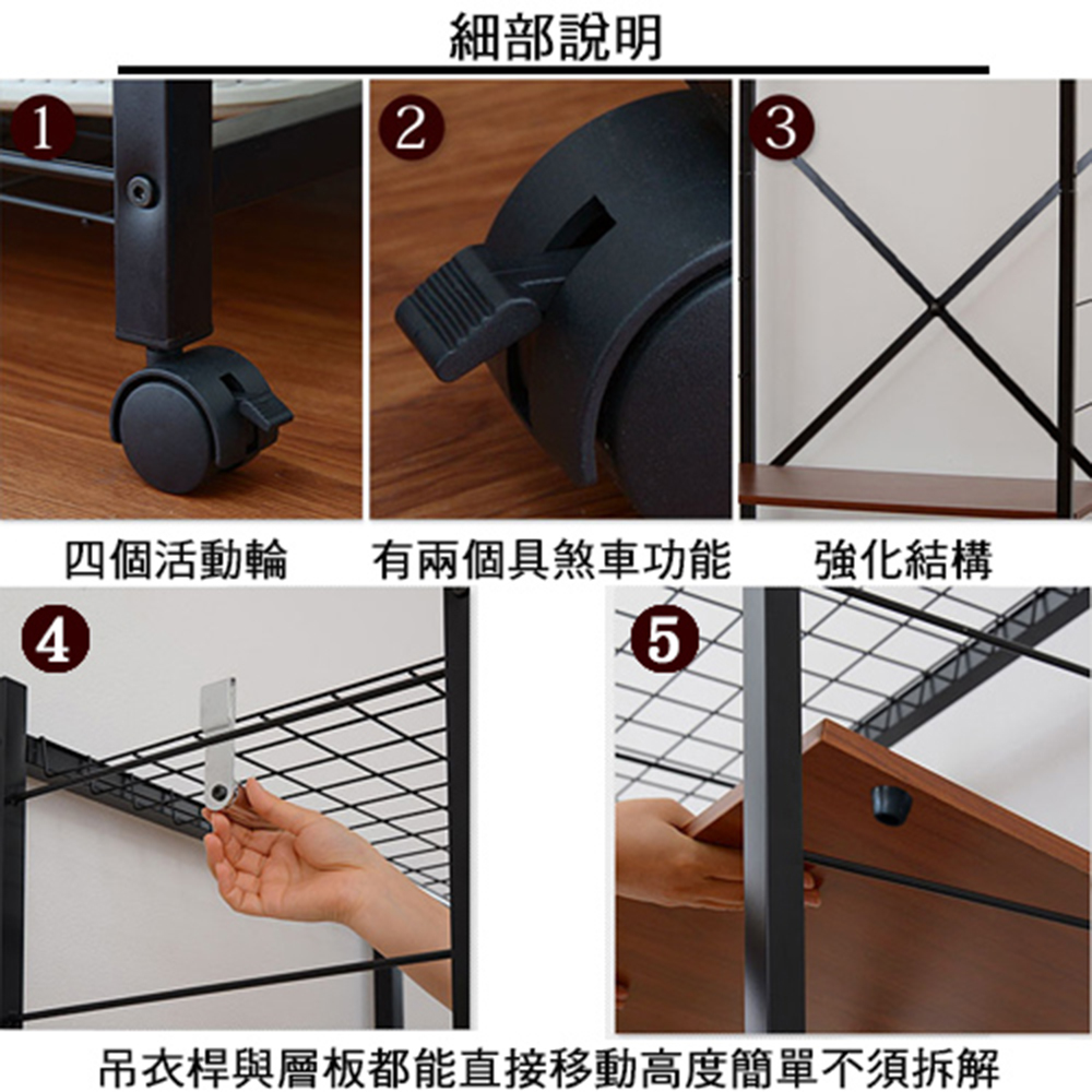 不景氣席捲全球,強調機能與外型的日本消費者,都開始回歸最基本的採購需求,設計新穎、簡單實用又兼具質感的商品目前在日本大行其道,《Justice》系列商品就是這波宅經濟的代表商品。《C&B》Justice移動式置物衣櫥架,是日本最新流行的復古『鐵』+『木』的組合商品,黑色烤漆的鐵管與木材紋路的木板,整體營造出工業復古風格,高質感有格調,100%台灣生產,採用符合日本市場要求的板材,表面使用防刮耐潑水的加硬波麗美耐處理,鐵管則是高質感的粉體塗裝烤漆,無論是層板的用料或鐵管的厚度與規格皆是外銷商品的要求,質感佳耐用性強。可依自己本身需要調整是本商品的設計重點,寬度119公分大容量,吊衣桿與層板都能夠隨使用者的需求在不需要卸下任何一個螺絲的情況下輕易地調整使用高度,創造多種使用模式,並能加購多組或同系列不同寬度的商品連接使用,完全符合您的使用需要。收納力:1. 置物網棚x上下各一2. 吊衣桿x23. 大層板x4 4. S掛勾x3機能性:1. 吊衣桿和層板皆可調整使用位置2. 附輪子可自在移動,四個活動輪當中更有兩個具煞車功能設計性:1. 工業風格兩種異素材的搭配,造型優雅2. 流行的外表,放置於房內使用提升質感■商品規格 尺寸 : 約(W)119*(D)45*(H)165.5CM 耐重 : 網棚:(約)5kg/個 層板:(約)5kg/個 吊衣桿:(約)20kg/支 主要材質 : 鐵管(粉體塗裝)、高密度塑合板(表面美耐處理) 產地 : 台灣 ■注意事項1.本商品附詳細組裝說明書,需DIY自行組裝。2.DIY商品經組裝後恕不接受退貨,請先確認商品是否符合要求。3.本商品僅配送至送貨地址一樓,無協助配送上樓,若司機願意配送上樓可能會有樓層費。4.商品圖檔顏色因電腦螢幕設定差異會略有不同,請以收到的實際商品顏色為準。5.若需退貨,請保持商品及包裝之完整性,無法回復原出貨之完整包裝恕不接受退換貨。6.送達地點有否限制:限本島,外島須外加運費。我們將事先與消費者聯繫報價,議定外島運費後,訂單始成立。7.本島偏遠地區接單說明:物流業者定義之本島偏遠地區接單須另加聯運費。我們將事先與消費者聯繫報價,議定聯運費後,訂單始成立。8.鑑賞期限制說明:溫馨提醒,鑑賞期非試用期, 敬請確認商品無瑕庛問題並確認購買後再使用。9.收到貨品時,要將外箱保留至鑑賞期結束,不要讓貨運公司將外箱帶走,換貨時換貨商品必須是全新狀態(不得有刮傷),並有完整的包裝,包含外紙箱、配件紙箱、保麗龍、保護袋、贈品等所有附隨文件或資料之完整性。10.偏遠地區概略表:以下地區為物流公司定義之偏遠地區,若有增刪皆以物流公司的認定為準。(1).新竹:尖石鄉、五峰鄉 (2).苗栗:泰安鄉 (3).台中:梨山、谷關、環山、和平鄉 (4).南投:鹿谷鄉、仁愛鄉 (5).雲林:古坑鄉 (6).嘉義:阿里山鄉、梅山鄉、嘉義農場 (7).高雄:內門鄉、杉林鄉、甲仙鄉、六龜鄉、甲仙鄉(小林村)、六龜鄉(寶來村) (8).屏東:霧台鄉、春日鄉、泰武鄉、三地門鄉 (9).宜蘭:大同鄉、南澳鄉 (10).花蓮:秀林鄉、池上鄉、海端鄉 (11).台東:長濱鄉、東河鄉(北源村)、台東地區(牧場&監獄)