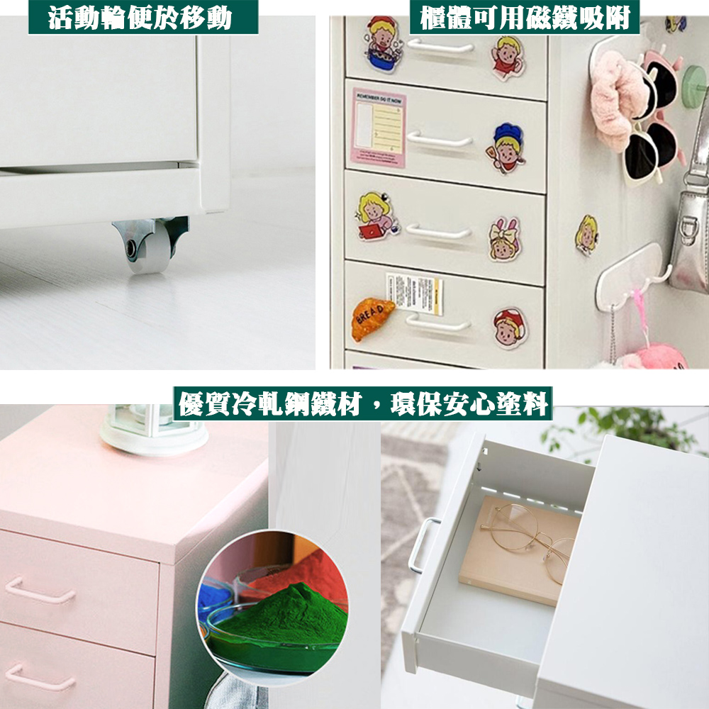 ★最新款式~主體與把手同色搶先上市,更具簡潔韓系風格,解決舊款電鍍把手生鏽問題★★極簡炫彩風格實用抽屜櫃~臥室、床頭、書房、廚房、客廳、陽台、辦公室等皆合用新款式新顏色新設計,增加韓風色系以及安全配備且完全不加價,每個抽屜皆有兩個卡扣設計,拉出抽屜時不會因操作不慎而讓抽屜落下,也不會因拉出一半抽屜即下傾,不掉落不下垂,更加安全且貼心好用。您時常為了收納帳單、合約、成績單、獎狀、證照、遙控器或DM等而頭疼不已嗎,除了塑膠收納的文件櫃以外您有更時尚的選擇!《C&B》鋼鐵斯特附輪五抽屜櫃,是外銷歐美日韓的暢銷商品,採用0.5mm優質冷軋鋼板,外表輔以先進健康環保的粉體處理,無毒無甲醛,作工精緻穩固耐用。一大四小抽屜的設計,收納量大,能容納A4尺寸的物品,可依需求收納在大抽屜或小抽屜內。底下附有四個活動滾輪,方便您隨心所欲的移動到需要使用的地方,文件櫃、收納櫃、工具櫃、床頭櫃、側邊櫃都很適合。■商品規格 尺寸 : 約(寬)28x(深)41x(高)69 公分(包度包含輪子,若不安裝輪子為67公分) 抽屜內寸 : 大抽屜 : 23 x 37 x 19 cm 小抽屜 : 23 x 37 x 9 cm 主要材質 : 冷軋鋼鐵板 ■注意事項 1.本商品附詳細組裝說明書,需DIY自行組裝。 2.DIY商品經組裝後恕不接受退貨,請先確認商品是否符合要求。 3.商品圖檔顏色因電腦螢幕設定差異會略有不同,請以收到的實際商品顏色為準。 4.若需退貨,請保持商品及包裝之完整性,無法回復原出貨之完整包裝恕不接受退換貨。 5.送達地點有否限制:限本島,外島須外加運費。我們將事先與消費者聯繫報價,議定外島運費後,訂單始成立。 6.本島偏遠地區接單說明:物流業者定義之本島偏遠地區接單須另加聯運費。我們將事先與消費者聯繫報價,議定聯運費後,訂單始成立。 7.鑑賞期限制說明:溫馨提醒,鑑賞期非試用期, 敬請確認商品無瑕庛問題並確認購買後再使用。 8.收到貨品時,要將外箱保留至鑑賞期結束,不要讓貨運公司將外箱帶走,換貨時換貨商品必須是全新狀態(不得有刮傷),並有完整的包裝,包含外紙箱、配件紙箱、保麗龍、保護袋、贈品等所有附隨文件或資料之完整性。 9.偏遠地區概略表:以下地區為物流公司定義之偏遠地區概略(實際以貨運公司定義為準)。 (1).新竹:尖石鄉、五峰鄉 (2).苗栗:泰安鄉 (3).台中:梨山、谷關、環山、和平鄉 (4).南投:鹿谷鄉、信義鄉、仁愛鄉 (5).雲林:古坑鄉 (6).嘉義:阿里山鄉、梅山鄉、嘉義農場 (7).高雄:內門鄉、杉林鄉、甲仙鄉、六龜鄉、甲仙鄉(小林村)、六龜鄉(寶來村) (8).屏東:霧台鄉、春日鄉、泰武鄉、三地門鄉 (9).宜蘭:大同鄉、南澳鄉 (10).花蓮:秀林鄉、池上鄉、海端鄉 (11).台東:長濱鄉、東河鄉(北源村)、台東地區(牧場&監獄)