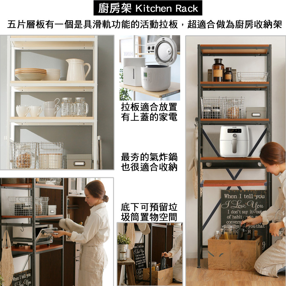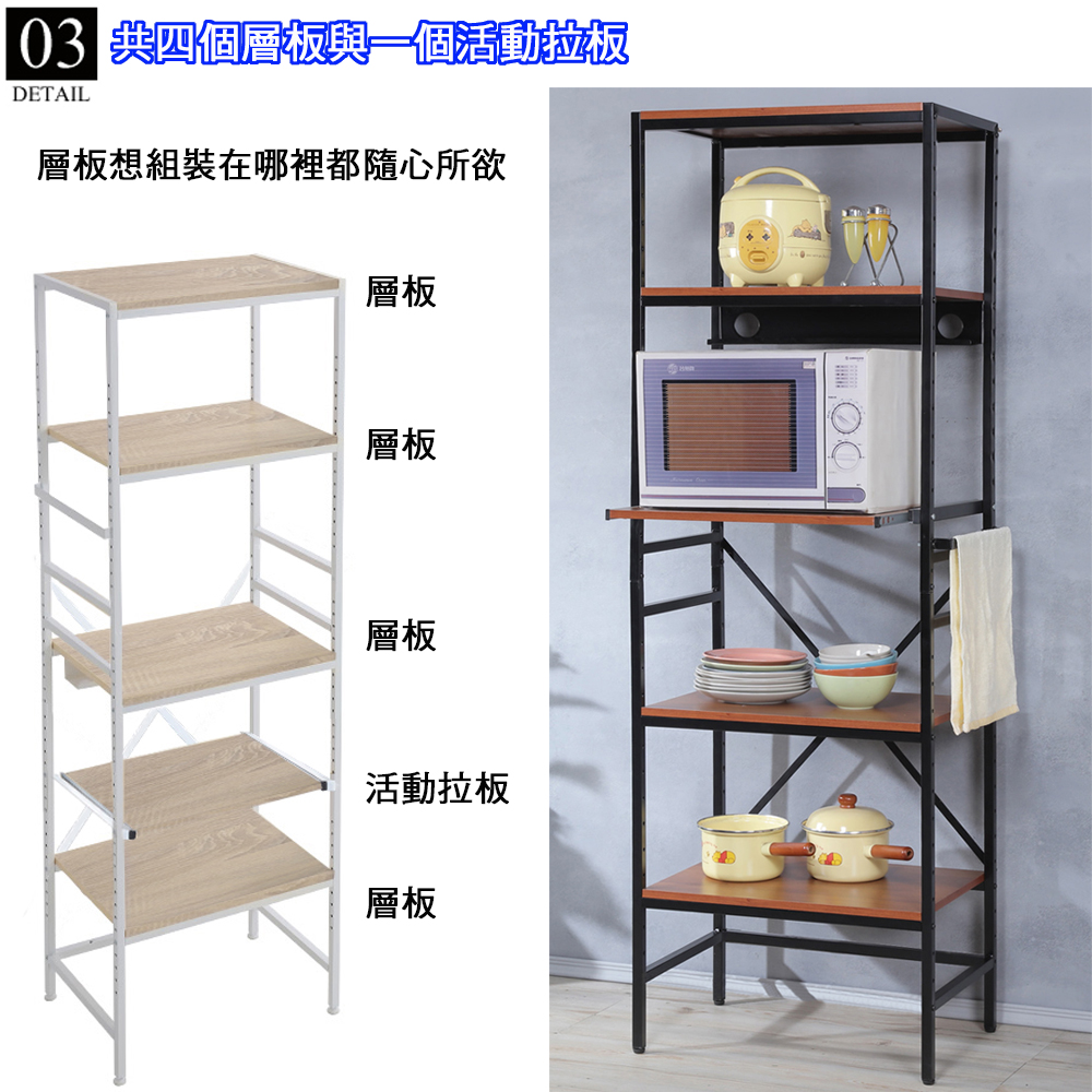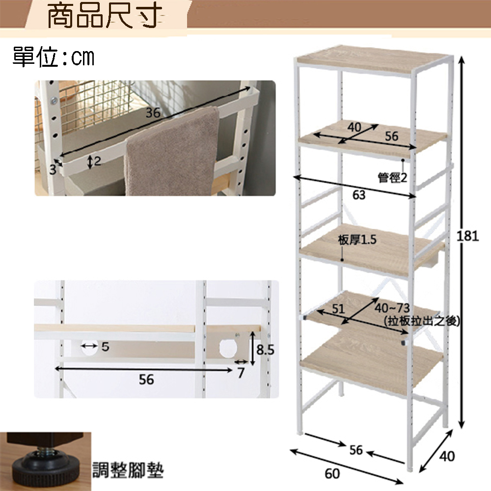 環保意識席捲全球,強調機能與外型的日本消費者,都開始回歸最基本的採購需求,設計新穎、簡單實用又兼具質感的商品目前在日本大行其道,《Justice》系列商品就是這波宅經濟的代表商品。《C&B》Justice依得多用途廚房衛浴收納置物架,是日本最新流行的復古『鐵』+『木』的組合商品,黑色或白色烤漆的鐵管與木材紋路的木板,整體營造出工業復古風格,高質感有格調,100%台灣生產,採用符合日本市場要求的板材,表面使用防刮耐潑水的加硬美耐板處理,鐵管則是高質感的粉體塗裝烤漆,無論是層板的用料或鐵管的厚度與規格皆是外銷商品的要求,質感佳耐用性強。可依自己本身需要調整是本商品的設計重點,側框從上到下共有32個孔位可供安裝層板,您可自行決定將四個層板與一個拉板安裝在任一個您想安裝的高度,完全符合您自身的使用需求,客製化般的貼心猶如量身訂做。層板尺寸56x40cm適用於所有的廚房家電,因為層板可以調整在任何的高度,廚房的各種家電無論現在正夯的氣炸鍋還是烤箱與微波爐都可收納,有上蓋的炊飯鍋或熱水瓶更可放置於活動拉板上,除了活動板還有多達4片的移動層板,廚房所有物品都能完整收納,絕對是最稱職的廚房置物架,擺放於洗衣室或衛浴空間內也非常適當哦。此外,有ㄇ形掛架能吊掛抹布毛巾或隔熱手套,在層板下方也設計了一個延長線插座放置架,在廚房家電種類越來越多的今日,貼心設計讓您使用電器線材不凌亂。收納力:1. 置物層板x42. 活動拉板x13. ㄇ形掛架x1 4. 延長線插座放置架x1機能性:1. 所有層板皆可調整使用位置共32段可調整2. 底部調整腳墊,可微調高度防止地面不平設計性:1. 工業風格兩種異素材的搭配,造型優雅2. 流行的外表,放置於室內使用提升質感■商品規格尺寸 : 約(W)60~64(ㄇ形掛架)*(D)40~73(拉板拉出後)*(H)181CM主要材質 : 鐵管(粉體塗裝)、高密度塑合板(表面美耐或PVC皮處理)產地 : 台灣■注意事項1.本商品附詳細組裝說明書,需DIY自行組裝。2.DIY商品經組裝後恕不接受退貨,請先確認商品是否符合要求。3.本商品僅配送至送貨地址一樓,無協助配送上樓,若司機願意配送上樓可能會有樓層費。4.商品圖檔顏色因電腦螢幕設定差異會略有不同,請以收到的實際商品顏色為準。5.若需退貨,請保持商品及包裝之完整性,無法回復原出貨之完整包裝恕不接受退換貨。6.送達地點有否限制:限本島,外島須外加運費。我們將事先與消費者聯繫報價,議定外島運費後,訂單始成立。7.本島偏遠地區接單說明:物流業者定義之本島偏遠地區接單須另加聯運費。我們將事先與消費者聯繫報價,議定聯運費後,訂單始成立。8.鑑賞期限制說明:溫馨提醒,鑑賞期非試用期, 敬請確認商品無瑕庛問題並確認購買後再使用。9.收到貨品時,要將外箱保留至鑑賞期結束,不要讓貨運公司將外箱帶走,換貨時換貨商品必須是全新狀態(不得有刮傷),並有完整的包裝,包含外紙箱、配件紙箱、保麗龍、保護袋、贈品等所有附隨文件或資料之完整性。10.偏遠地區概略表:以下地區為物流公司定義之偏遠地區,若有增刪皆以物流公司的認定為準。(1).新竹:尖石鄉、五峰鄉 (2).苗栗:泰安鄉 (3).台中:梨山、谷關、環山、和平鄉 (4).南投:鹿谷鄉、仁愛鄉 (5).雲林:古坑鄉 (6).嘉義:阿里山鄉、梅山鄉、嘉義農場 (7).高雄:內門鄉、杉林鄉、甲仙鄉、六龜鄉、甲仙鄉(小林村)、六龜鄉(寶來村) (8).屏東:霧台鄉、春日鄉、泰武鄉、三地門鄉 (9).宜蘭:大同鄉、南澳鄉 (10).花蓮:秀林鄉、池上鄉、海端鄉 (11).台東:長濱鄉、東河鄉(北源村)、台東地區(牧場&監獄)