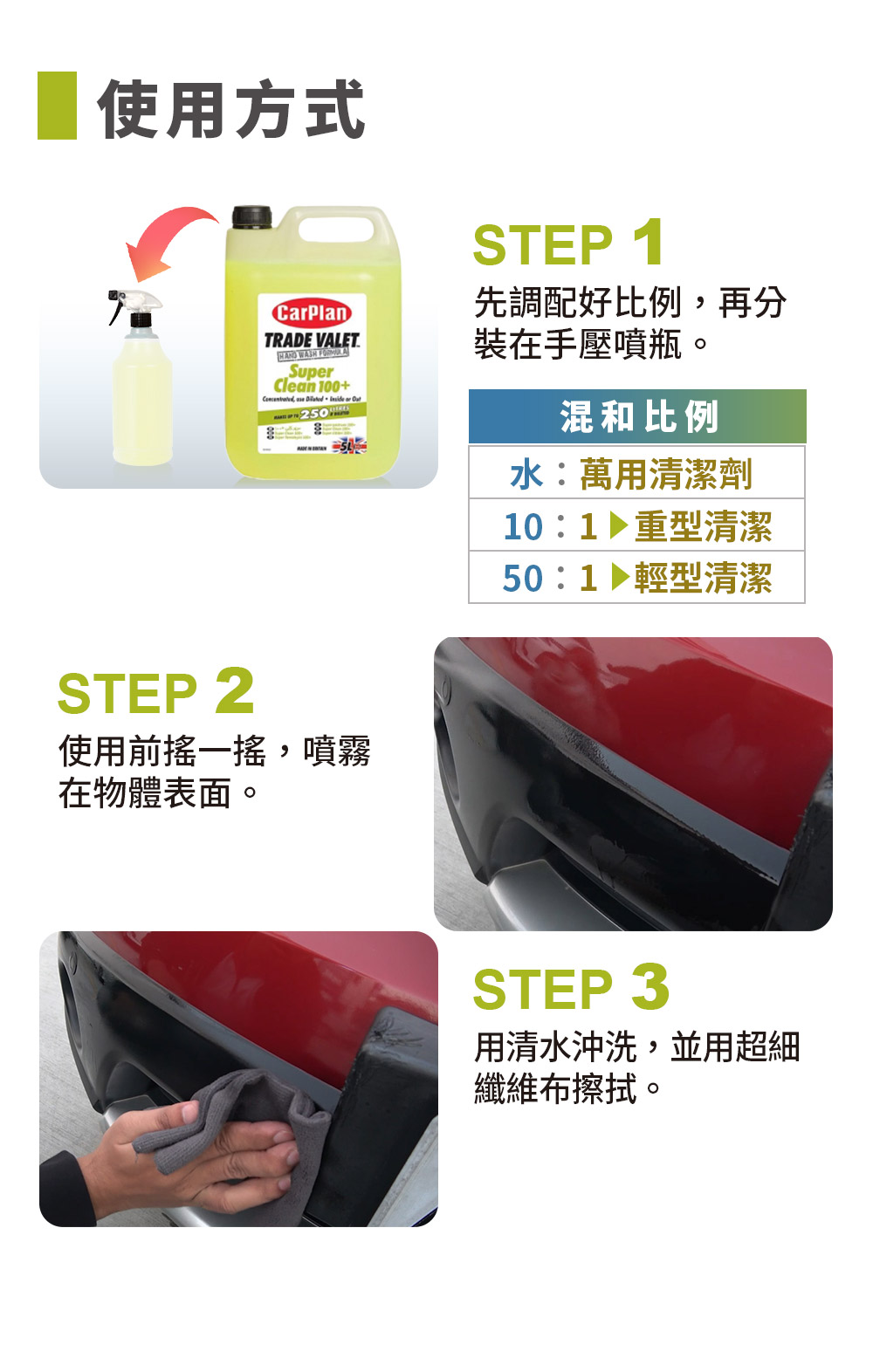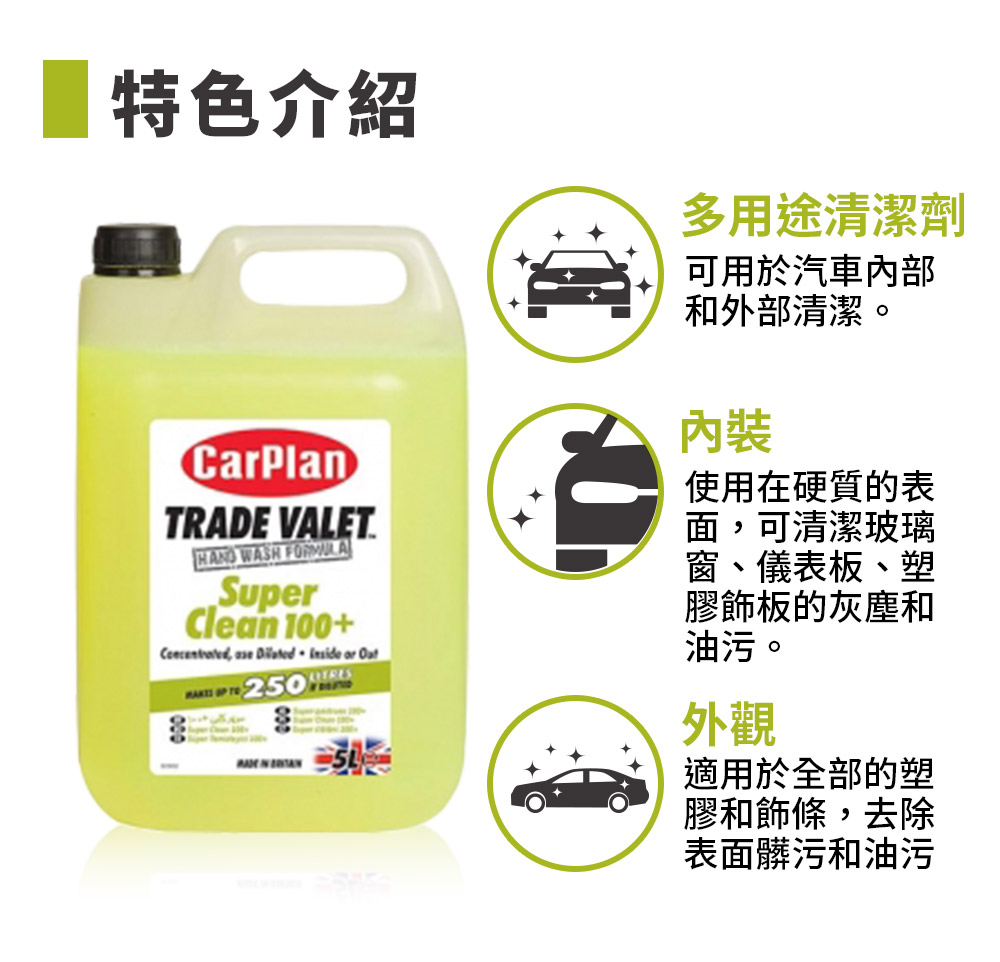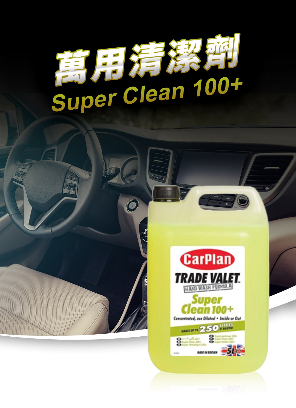 規格說明. 品牌:CarPlan卡派爾. 品名:TRADE VALET Super Clean 100+ 萬用清潔劑. 成分:Phosphates、Non-ionic surfactants、Perfumes. 包裝:5公升/桶. 產地:英國