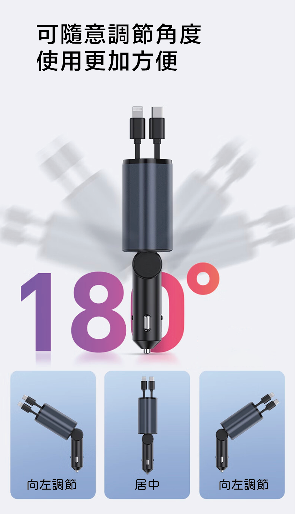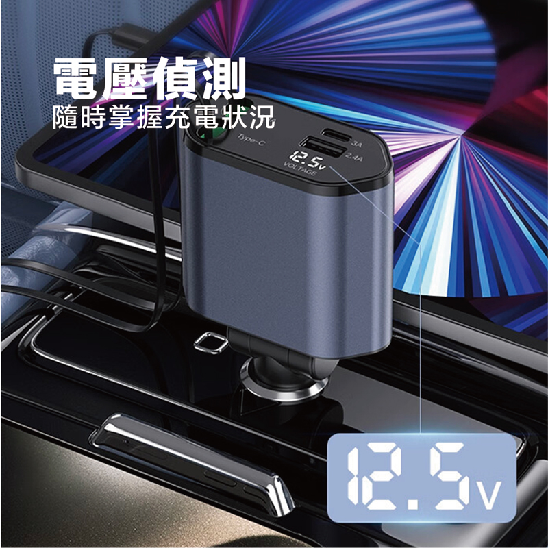 🚗 為什麼你需要這款車充?✅ 120W大功率快充,支援 QC3.0快充協議,手機、平板、筆電、行車記錄器,一次搞定!✅ 內建雙線可伸縮:Type-C + Lightning 80cm長度隨拉隨用,告別纏線煩惱!✅ USB + Type-C雙孔擴展:滿足車內多設備充電需求!✅ 智慧晶片控溫,內建智慧晶片,六重安全防護,低溫不傷機,穩定輸出更安全!✅ LED電壓顯示,隨時掌握愛車電壓狀況,避免電瓶沒電!✅ 12V/24V車型通用,不管是小轎車、SUV、還是貨車都能用!✅ QC3.0快充協議,支援多種設備,充電速度翻倍提升!✅ 隨插即充 — 無需對準,輕鬆補電✅ 多設備同時充電 — 手機平板同時充電不等待✅ 智能電流調節,快充不傷機,電量滿格超省心✅ 免挖孔設計,安裝超簡單!✅ 牢固不掉電:顛簸路況依然穩定輸出,ABS+PC材質抗摔又耐用,行車更安心!