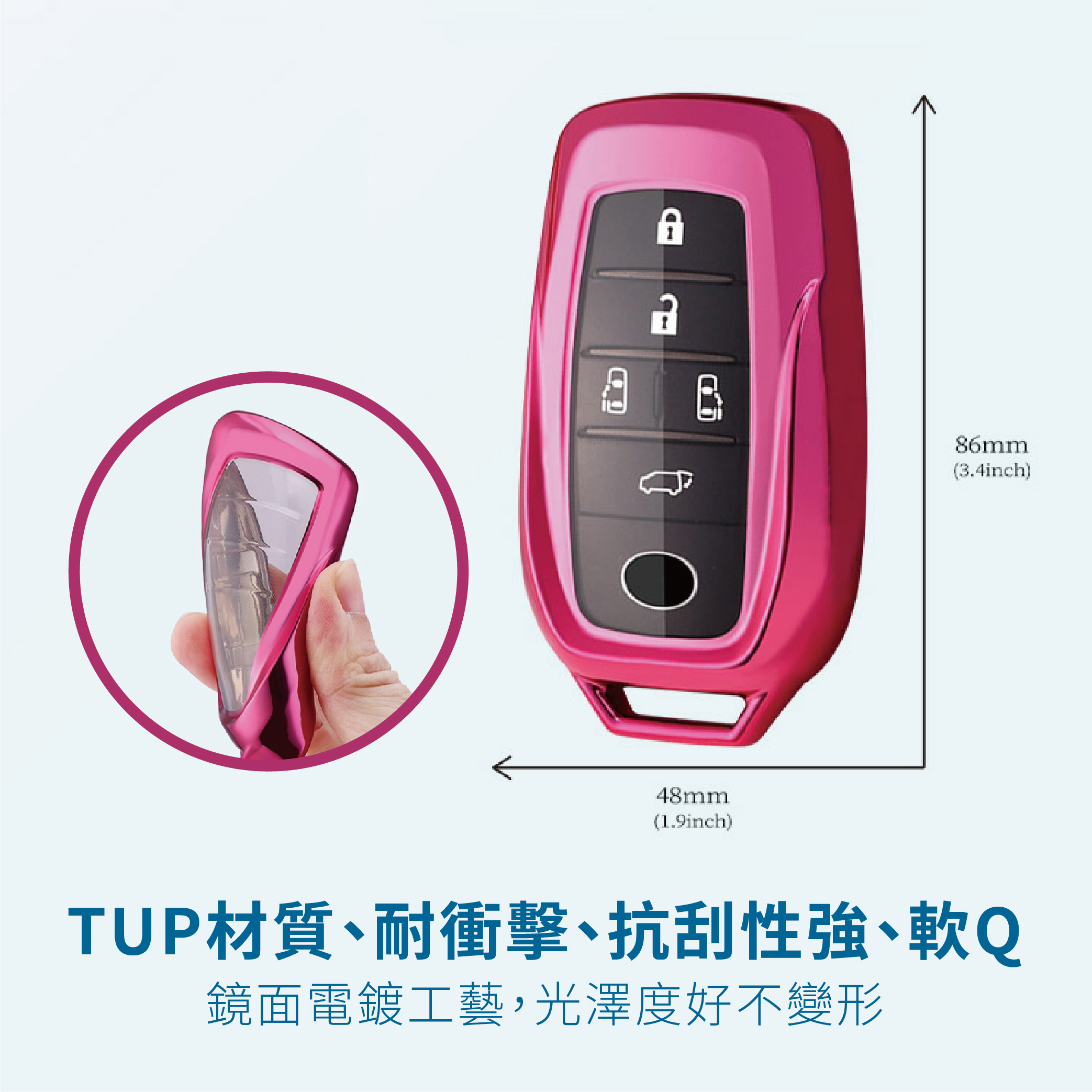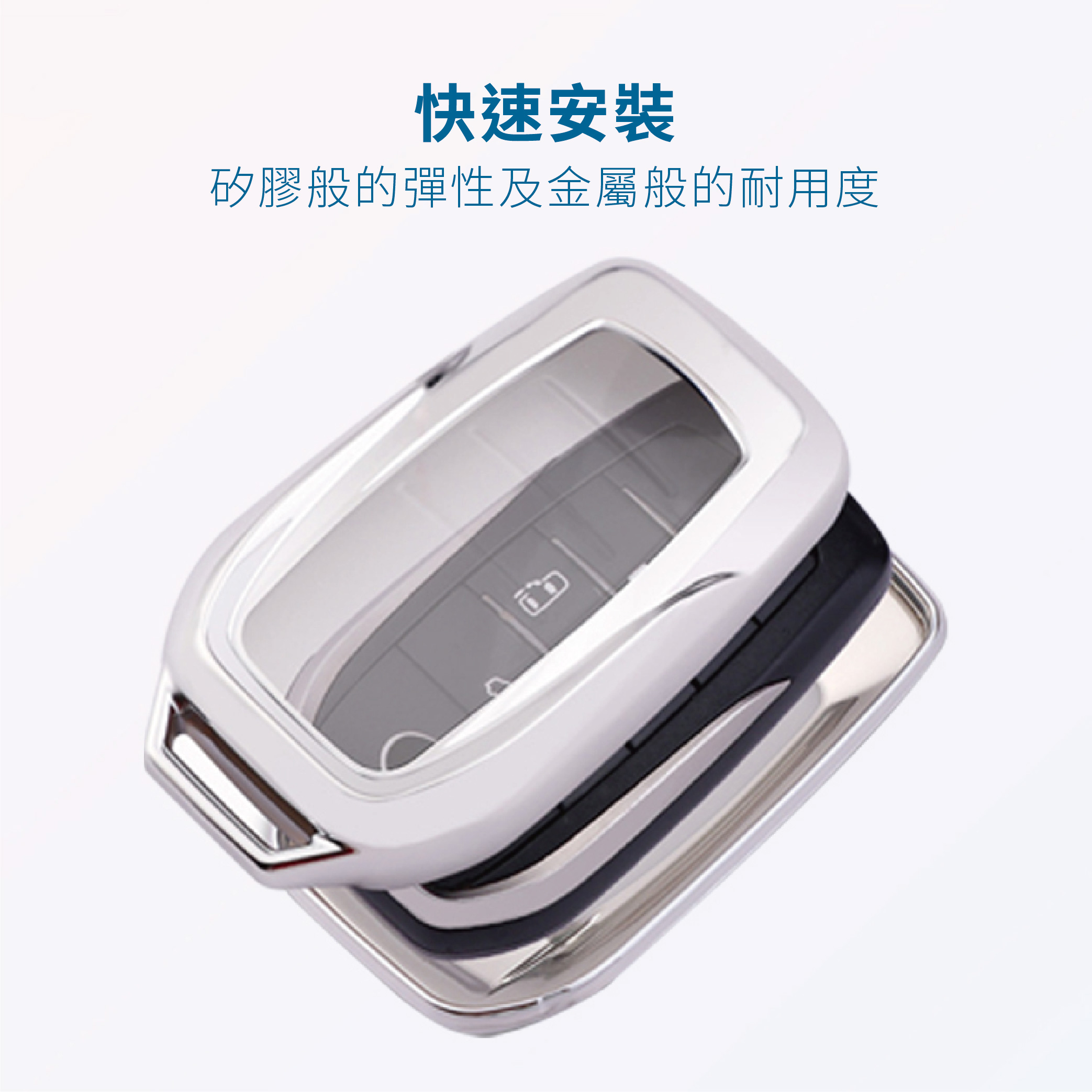 【產品優勢】★年輕簡約配色。★納米TPU材質可反複使用便於清洗★柔韌有彈性的透明膜可防止指甲劃傷按鍵★手感舒適柔軟,回彈性強★不影響信號 ,按鍵靈敏不影響按鍵感應,信號依舊★鏡面電鍍工藝,耐刮防摔★360° 全面保護,防爆 抗摔 高檔時尚 無信號影響 全包防水防刮 保護愛車鑰匙★雙層保護,集美觀實用於壹身★分體式安裝設計,TPU材質環保時尚★量身定制的原始汽車鑰匙★散熱材料 – 吸汗, 防止異味