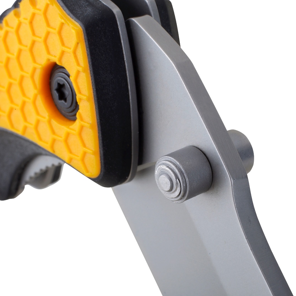 CAT八吋多功能折疊刀,採用黃色TPR止滑耐磨材質,不僅擁有與眾不同的極佳外觀,並且大幅提升使用時的舒適和便利性。 折疊刀為鋁合金材質手柄結合了耐用、輕便和時尚於一體,刀刃採用7CR17MOV合金鋼具有高硬度和超強韌性,材質兼具高硬度與超強韌性,使折疊刀極為鋒利而又耐用,可做為安全防身工具、登山露營折疊刀與戰術刀 。CAT八吋多功能折疊刀具有刀片安全鎖定裝置,此為CAT工具獨家專利設計,在使用時,刀刃固定不摺疊收回,大大的提高使用時的安全與便利性。另外刀桿上的螺柱提供使用者單手快速展開折疊刀。另一方面,在刀柄上加上經實驗室核可的窗戶擊破功能,可做為車上安全逃生工具使用。