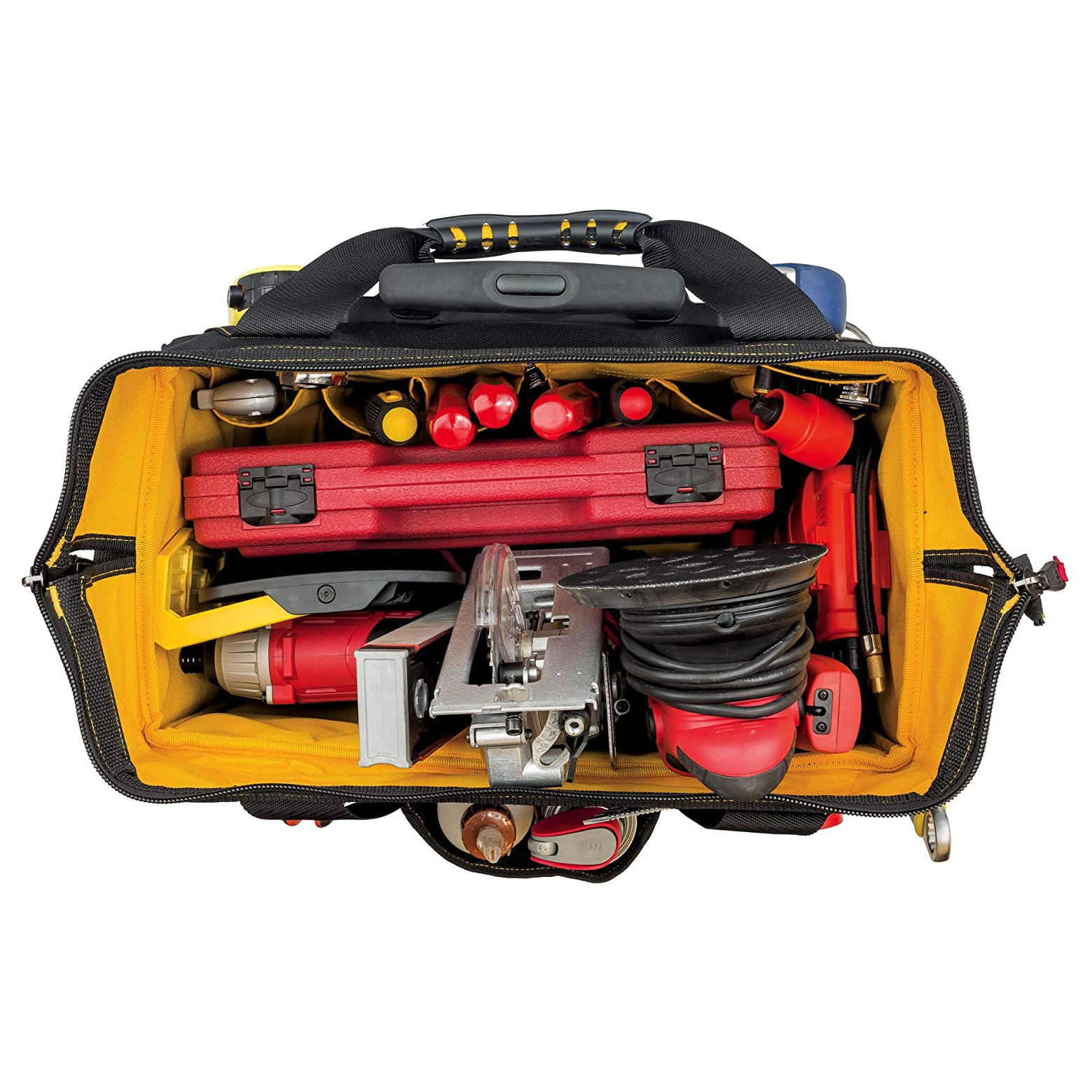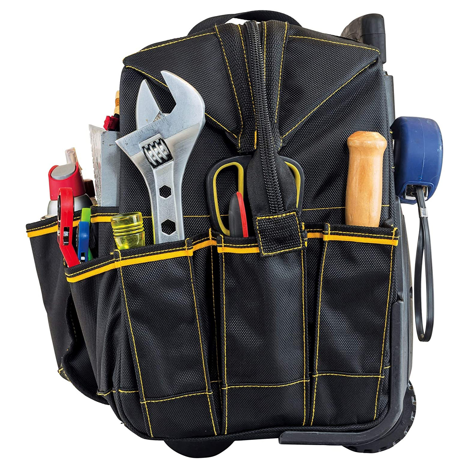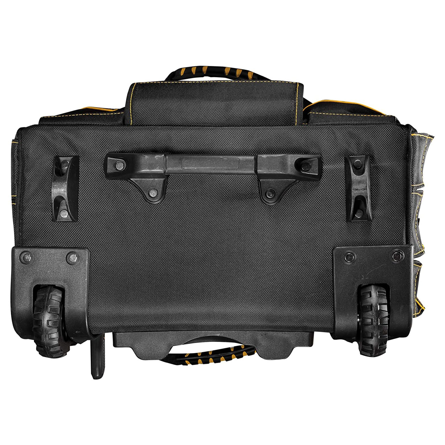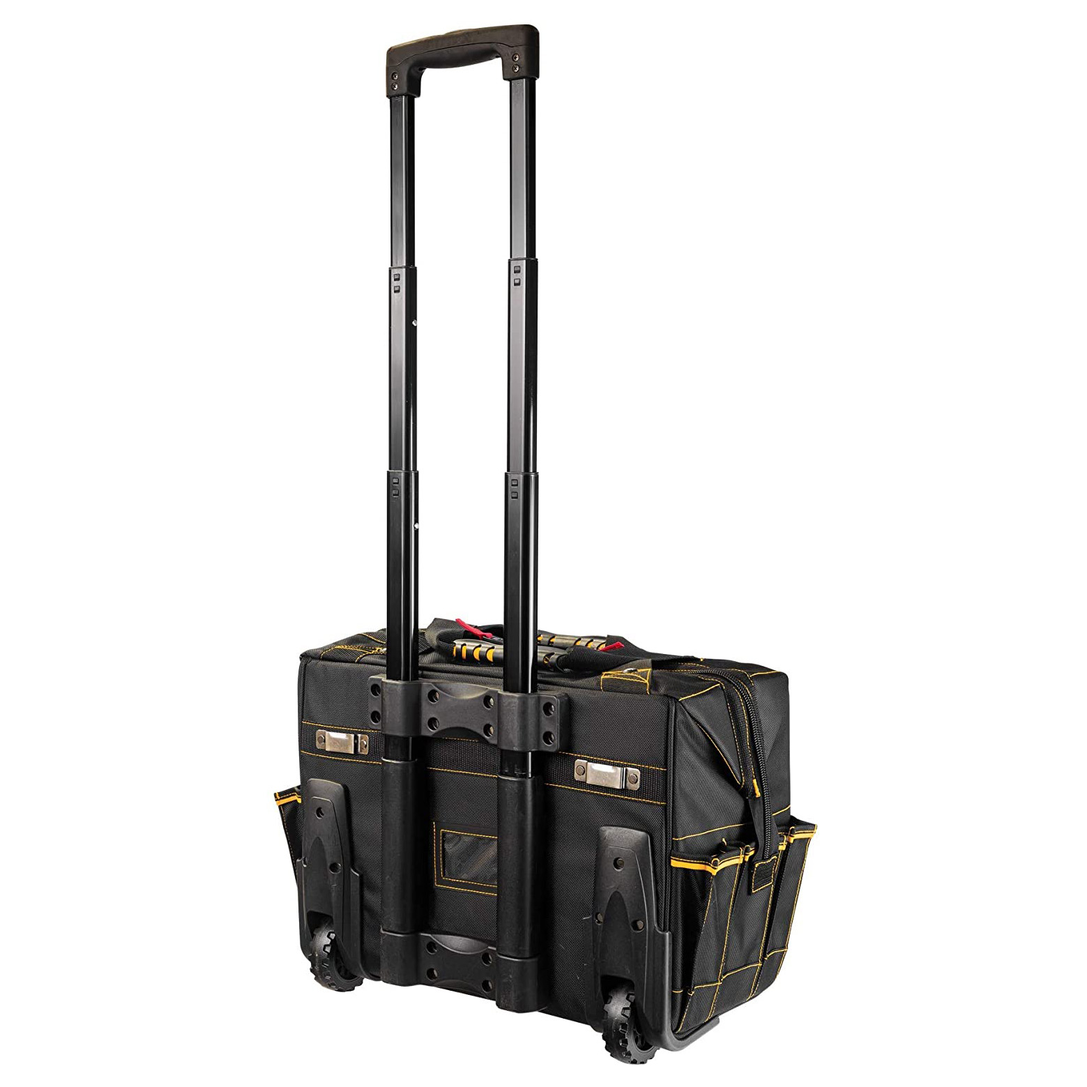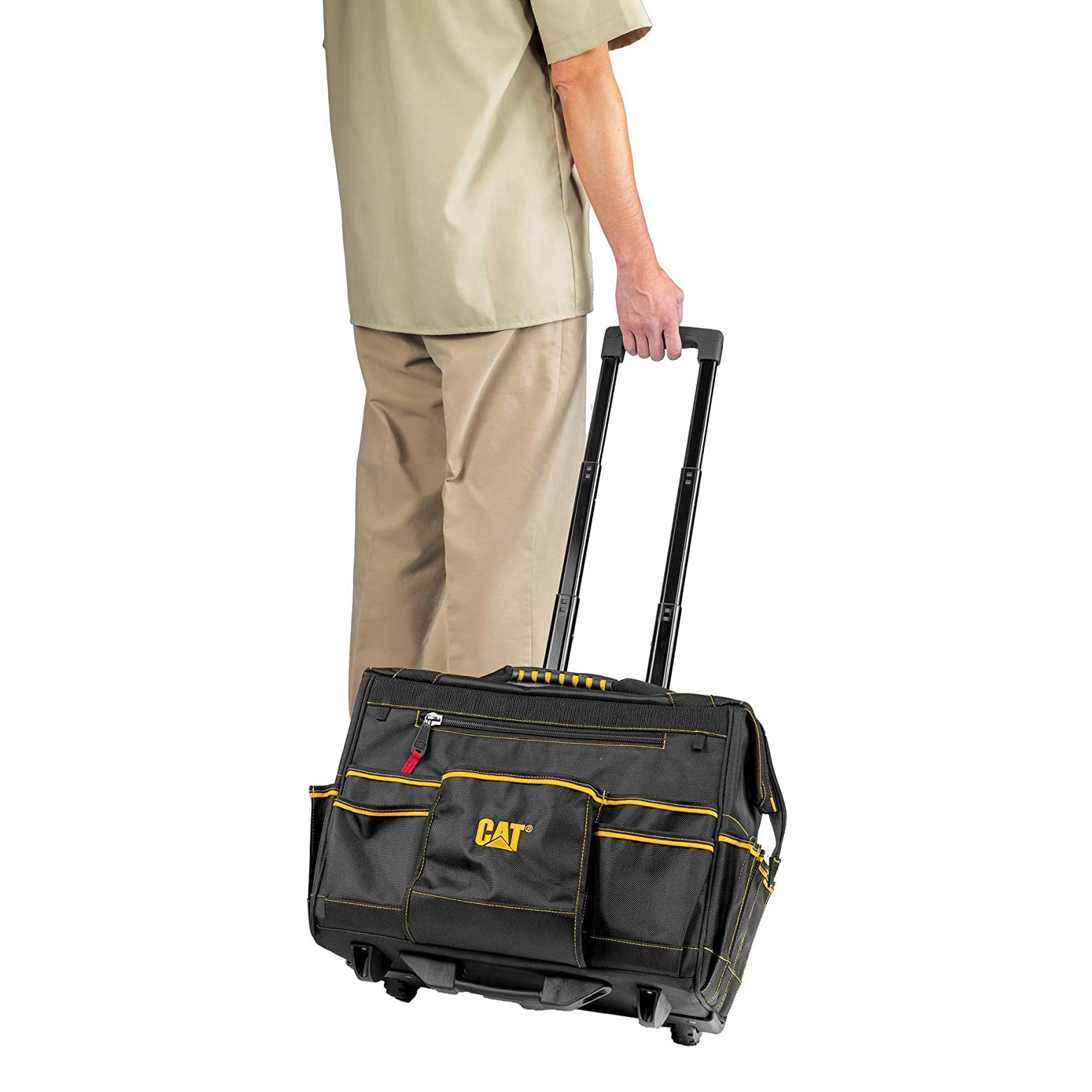 CAT工具18 英吋工具箱具有伸縮式拉桿和超大輪子,方便於在各種工作場所移動操作。工具拉桿箱包括 18 個工具置物空間與主儲物箱。拉桿工具袋採用最高等級1680D牛津布材質製成,並採用加強型縫合技術於每個工具袋接縫處,使拉桿箱具有超高耐用和防潑水特性。拉桿箱底部和側邊均由增強注塑成形,硬殼結構可防止拉桿箱潮濕、撕裂和磨損。主儲物箱採CAT工具高辨識度黃底設計,可輕易收納各式電動工具、電源線、電線、充電器、儀表等。 6 個內部口袋和 12 個外部口袋為您最常用的工具、儀表和裝備提供了方便的存儲空間。