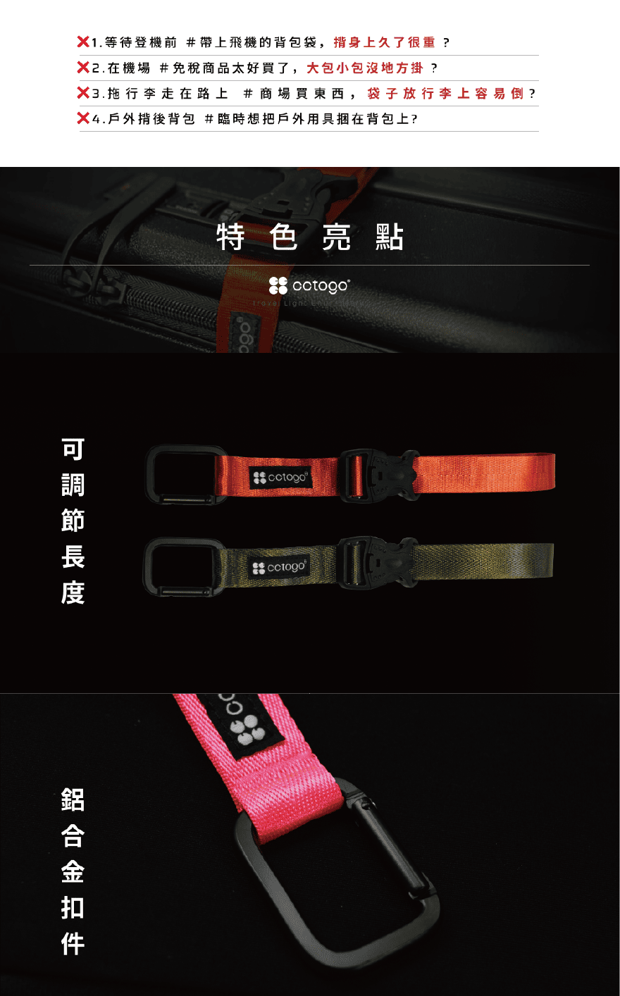 行李太多?這一扣,全部搞定。cctogo行李掛鉤釦,選用安全扣設計,穩固耐用不脫落,適用各式行李箱、手提袋、後背包、甚至嬰兒車與推車。✔︎ 安全扣件設計,穩固不脫落✔︎適用行李箱、各類包袋、嬰兒車、推車...等✔︎可調節長度,隨意吊掛✔︎9色可選,輕鬆搭配你的旅行風格每一扣,都是貼心的旅行小幫手。