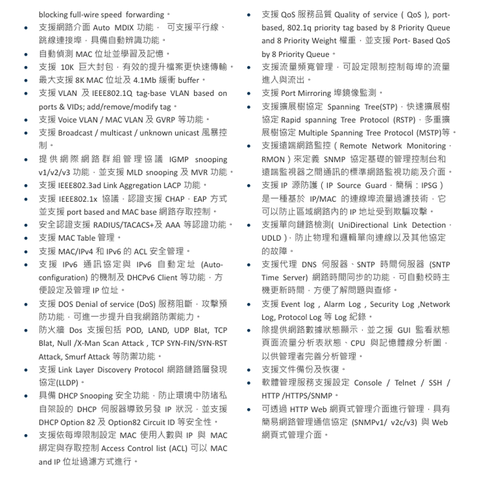 • 支援 Voice VLAN / MAC VLAN 及GVRP等功能。