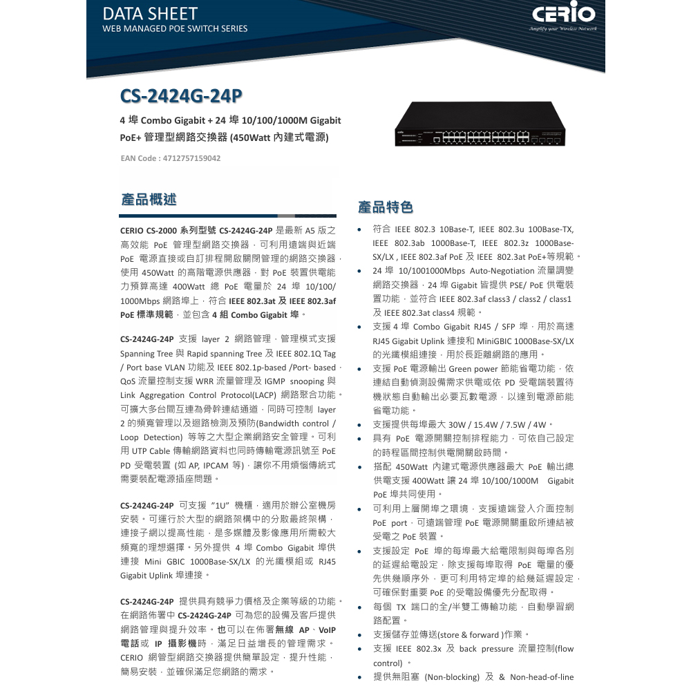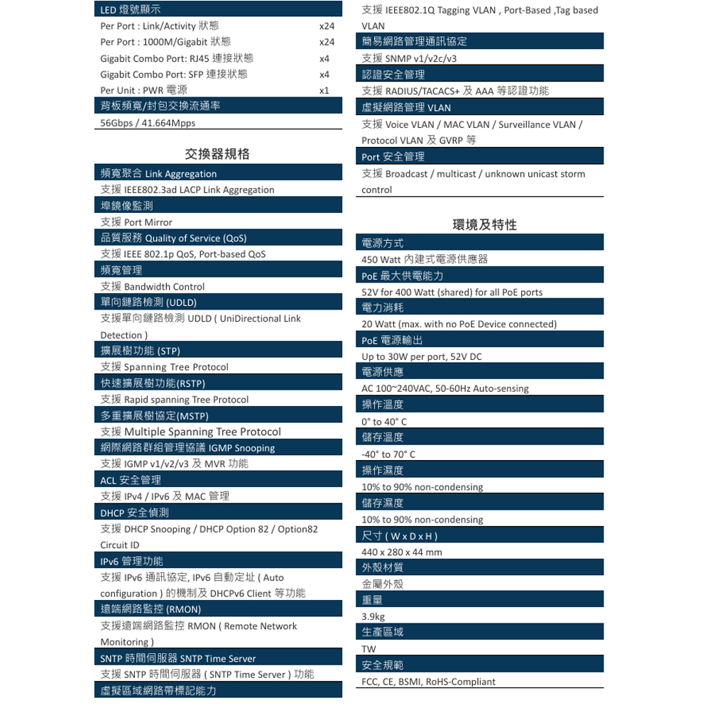 • 24埠 10/1001000Mbps Auto-Negotiation流量調變網路交換器,24埠Gigabit皆提供PSE/ PoE 供電裝置功能,並符合IEEE 802.3af class3 / class2 / class1及IEEE 802.3at class4規範。
