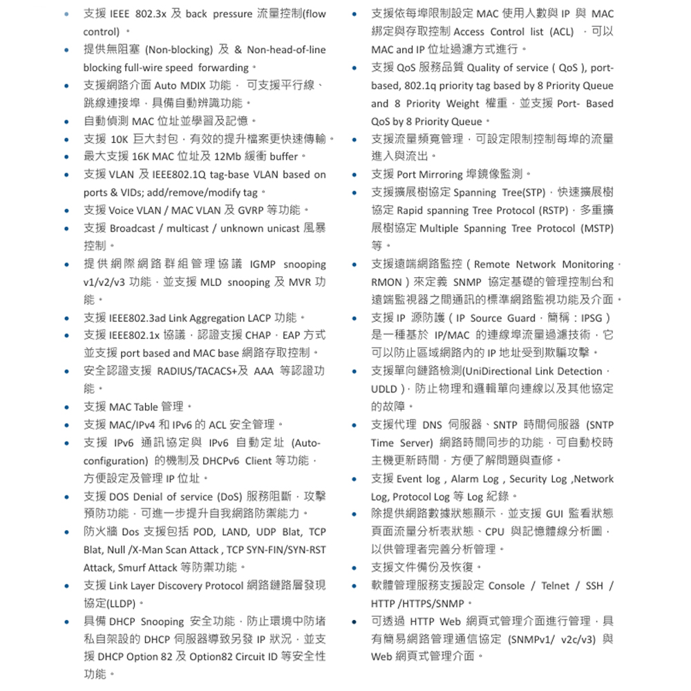 •支援QoS服務品質Quality of service ( QoS ), port- based, 802.1q priority tag based by 8 Priority Queue and 8 Priority Weight 權重,並支援Port- Based QoS by 8 Priority Queue。