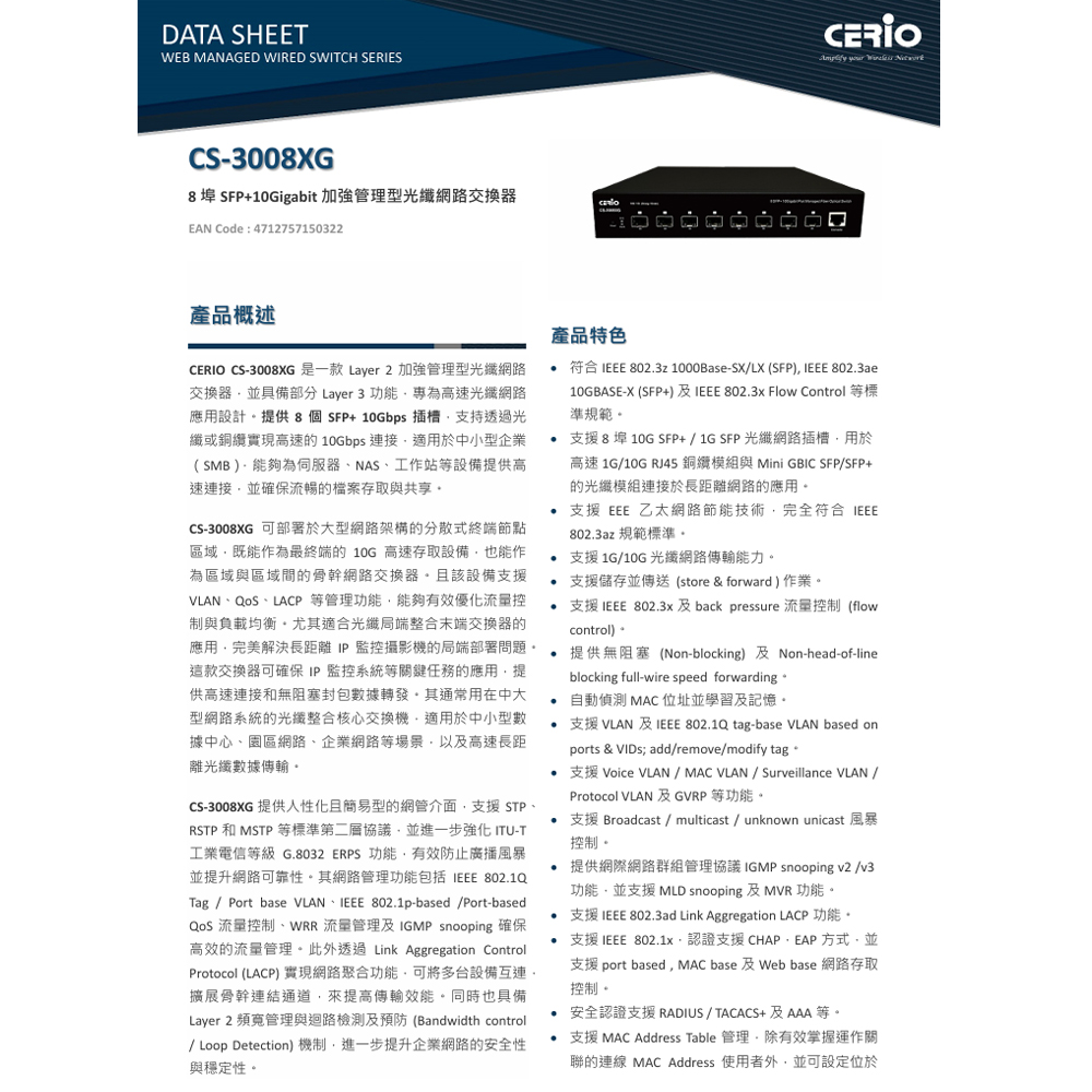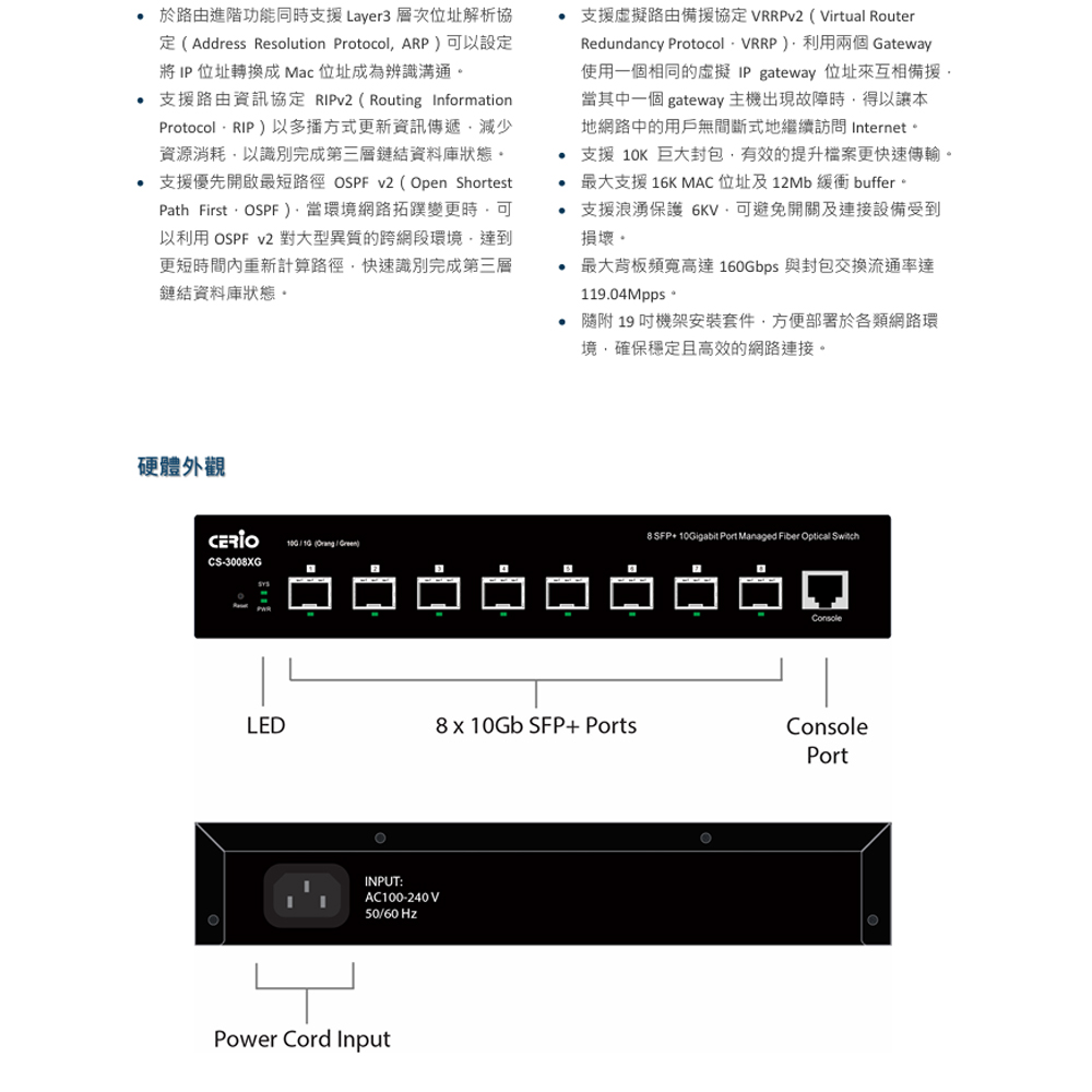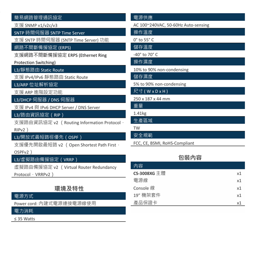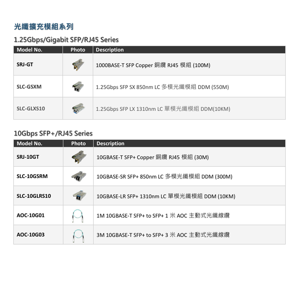 • 符合IEEE 802.3z 1000Base-SX/LX (SFP), IEEE 802.3ae 10GBASE-X (SFP+) 及IEEE 802.3x Flow Control等標準規範。
