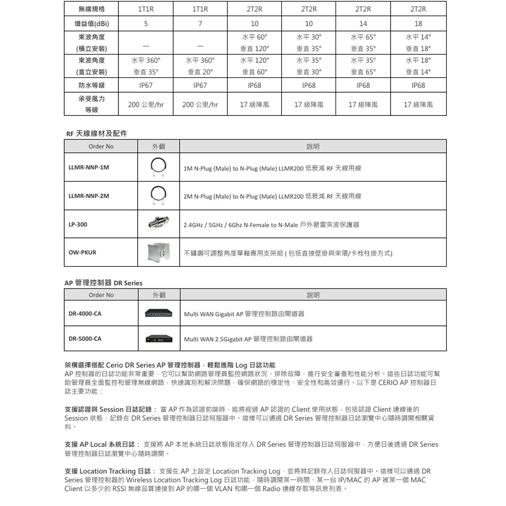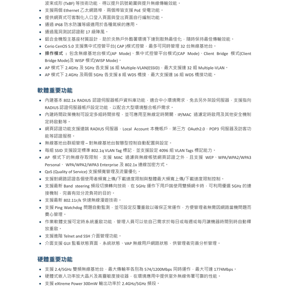 • 操作模式 : 包含無線基地台模式(AP Mode)、集中式控管平台模式(CAP Mode)、Client Bridge 模式(Client Bridge Mode)及 WISP 模式(WISP Mode)。