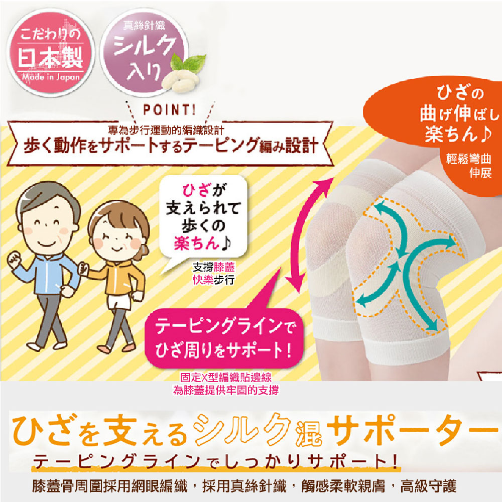 ・切り替え編みのテーピングラインでひざをしっかりとサポートします。・ひざ裏とひざ頭はメッシュ編みになっているので通気性がよくムレにくいです。・伸縮性のよいニットタイプ。・薄手なのでごわつきにくく、お洋服の下にも履きやすいです。・日常動作のサポートとしても、散歩などの軽い運動時にもお使いいただけます。・シルクを使用して編み立てているので、優しい肌あたりです。*日本最受歡迎醫師推薦護具。*日本製造真絲針織材質,固定X型編織貼邊線,為膝蓋提供牢固的支撐。*護膝,膝蓋骨周圍採用網眼編織,透氣不悶熱。*超彈力伸縮,舒適不緊繃。*薄、柔、細緻、高雅,可以輕鬆的穿在衣服下面。*剪裁一體成型無接縫,穿搭無不適感,用作日常活動或散步等輕度運動的支撐。*採用真絲針織,觸感柔軟親膚,高級守護。 注意事項本品不具醫療效果。有下列情況者,使用前請先諮詢醫師:穿戴部位有傷口/搔癢/孕婦/高血壓/心臟/腎臟疾病/血循不佳/糖尿病/皮膚炎。合成纖維過敏者,請勿過度勒緊。使用中若有不適,請停止使用並諮詢醫師。請勿強力拉扯,避免損壞商品。請放置於嬰幼兒不易拿取處 。 請勿接近火源。使用效果因人而異。 材 質:超彈性尼龍、絲綢 顏 色:象牙白尺 寸:膝圍25-45cm洗滌方式:手洗/水溫低於40C/中性洗劑/勿漂白/勿烘乾/勿熨燙/陰涼處懸掛晾乾/勿專業乾洗產 地:日本製國際條碼:4985697252597https://s-cf-tw.shopeesz.com/file/tw-11134208-23030-u5wigxk6t5nv4f