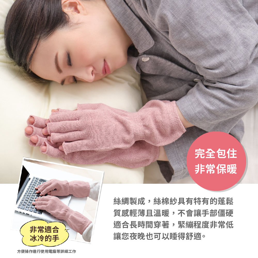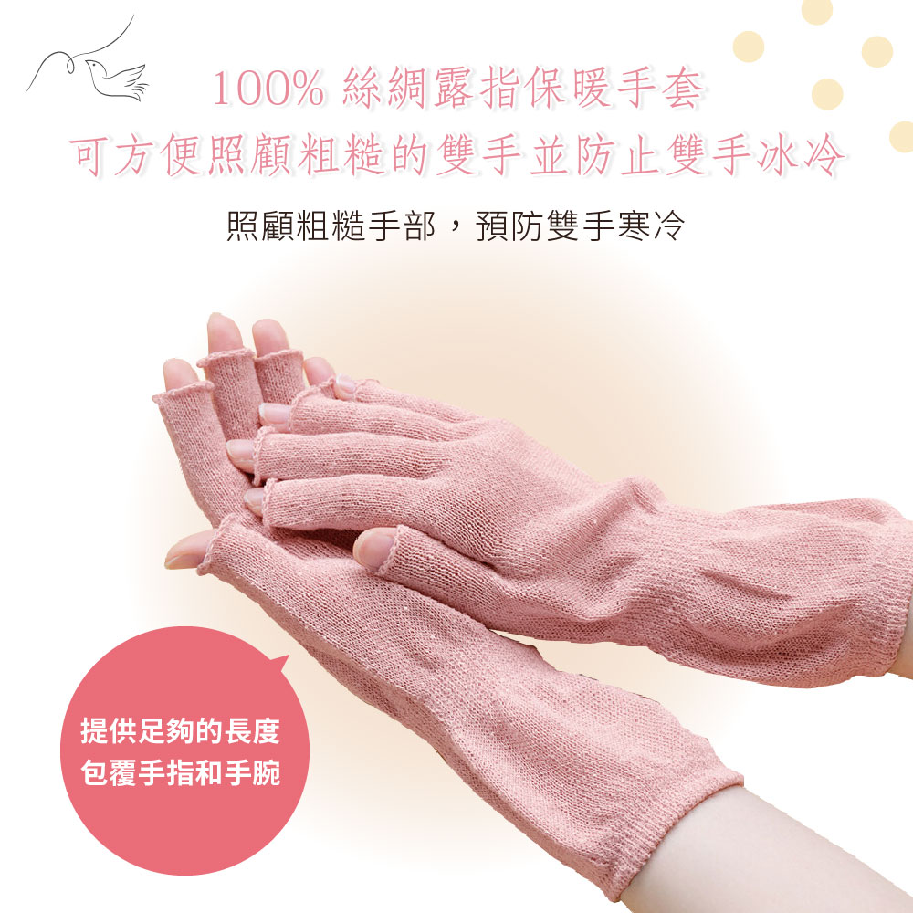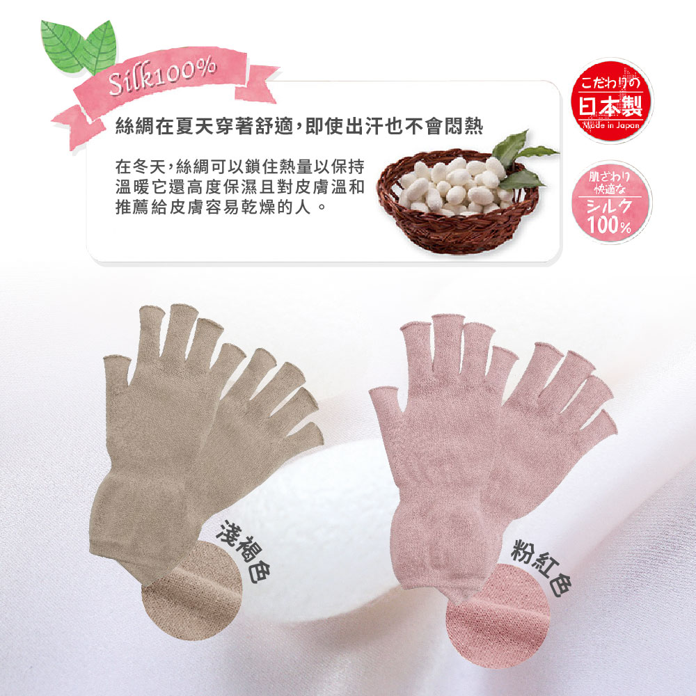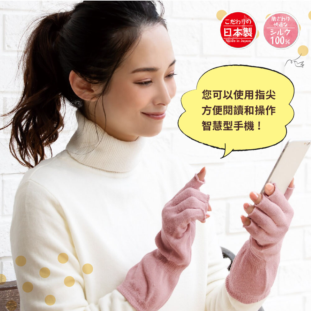 日本製【CERVIN】絲綢露指保暖手套・手荒れのケアや手元の冷え対策に便利なシルク100%のハンドウォーマーです。・スマートフォン操作や読書、パソコンなどの細かい作業をするときも便利な指あきタイプです。・指部分と手首部分は長めの設計で、しっかり保温します。・長時間つけていても締め付けの少ないゆったりとしたサイズ感です。・度重なる手洗いや消毒で負担が多くなった手肌を優しく包み込みます。・シルクのわたをつむいだ糸は、ふんわりとした風合いが特徴的です。・シルクは吸放湿性に優れた繊維です。そのため夏は汗をしっかり吸収して外へ放出し、冬は熱を閉じ込めてくれるため、むれずに快適な温かさを保ちます。 *這些 100% 絲綢暖手器可方便照顧粗糙的雙手並防止雙手冰冷。*手指開口方便操作智慧型手機、閱讀或進行使用電腦等詳細工作。*手指和手腕部分設計得足夠長,可以讓您的雙手保持溫暖。*寬鬆版型,適合長時間穿著,緊繃程度極低。*輕輕包裹經過反覆洗手消毒的手部皮膚。*絲棉紗具有特有的蓬鬆質感。*蠶絲是一種具有優良吸濕、放濕性能的纖維。因此,它在夏天吸收汗水並釋放到室外,在冬天鎖住熱量,讓您保持舒適溫暖而不腫脹。 《注意事項》本品不具醫療效果。請勿過度勒緊,使用中、使用後若有不適,請停止使用並諮詢醫師。就寢時請勿穿戴。請勿穿戴於有傷口、皮膚炎、皮膚發癢部位,或對橡膠製品有過敏者。請勿強力拉扯,避免損壞商品。請放置於嬰幼兒不易拿取處。請勿接近火源。使用效果因人而異。 材質:100% 絲綢尺寸:手圍19-22cm顏色:粉紅色、淺褐色洗滌方式:水溫攝氏30度以下/手洗/中性洗劑/勿漂白/勿烘乾/勿熨燙/陰涼處懸掛晾乾/勿專業乾洗/輕輕擠壓過多水分後陰乾/陰涼處定型懸掛晾乾/請勿將織物長時間暴露在陽光或螢光燈下,否則可能會導致褪色/請勿擰乾織物、壓洗產地:日本製國際條碼:粉紅色4985697253631淺褐色4985697253648