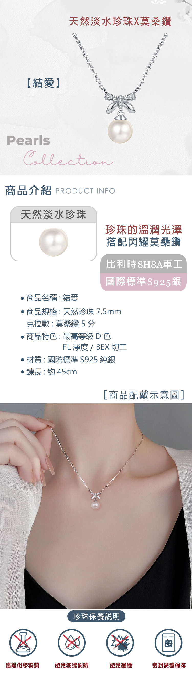 【CF鑽飾|CF Diamond】 頂級CF鑽:火彩、亮度、均比鑽石更閃耀、燦爛 ●商品規格: 天然淡水珍珠x莫桑鑽 ●珍珠規格:7.5mm ●主鑽克拉數 : 5分 ●商品特色:最高等級D色 / FL淨度 / 3EX切工 ★切工:八心八箭邱比特比利時切工,完美切割57個切面,璀璨光芒 ★材質:國際標準S925純銀,抗過敏,抗氧化 ★配鑽:小鑽款式 商品標準配備: -附專用拭銀布 -原廠精美歐式禮盒、提袋,送禮自用兩相宜 【購買注意事項】 -因人工測量及於電腦螢幕色差等非人為因素,商品實際尺寸&顏色可能存在微小差異,請以收到實際商品為主! 【貼心小提醒】 -銀製飾品會因接觸到空氣、汗水氧化時而變黑時,可使用拭銀布擦拭,立即恢復它的光澤亮麗色彩 -請勿浸泡溫泉水及化學藥劑、清潔劑之中 -因拭銀布本身有藥劑,使用完畢後記得洗手!!