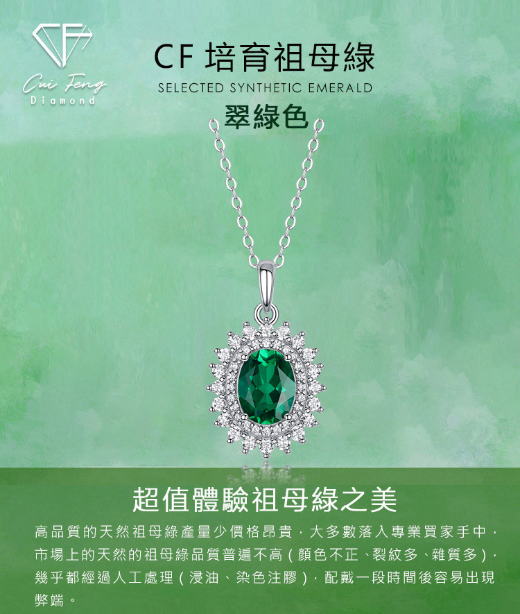 【CF鑽飾|CF Diamond】頂級CF鑽:火彩、亮度、均比鑽石更閃耀、燦爛●主鑽商品:培育祖母綠★材質:國際標準S925純銀,抗過敏,抗氧化★配鑽:7A璀璨方晶●商品標準配備:-附專用拭銀布-原廠精美歐式禮盒、提袋,送禮自用兩相宜【購買注意事項】-因人工測量及於電腦螢幕色差等非人為因素,商品實際尺寸&顏色可能存在微小差異,請以收到實際商品為主!【貼心小提醒】-銀製飾品會因接觸到空氣、汗水氧化時而變黑時,可使用拭銀布擦拭,立即恢復它的光澤亮麗色彩 -請勿浸泡溫泉水及化學藥劑、清潔劑之中 -因拭銀布本身有藥劑,使用完畢後記得洗手!!