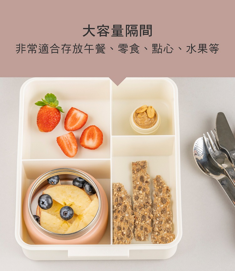 ✔通過SGS 認證德國LFGB食品容器驗證合格✔4格大隔間防漏矽膠的分隔餐盒✔可拆式矽膠條方便清洗✔內含 1 個保溫食品罐✔大容量隔間非常適合存放午餐、零食、點心、水果✔輕便容易攜帶✔不含 BPA 和鄰苯二甲酸鹽,不含有毒材料✔僅能手洗。不適用於洗碗機✔不可微波爐或冷凍