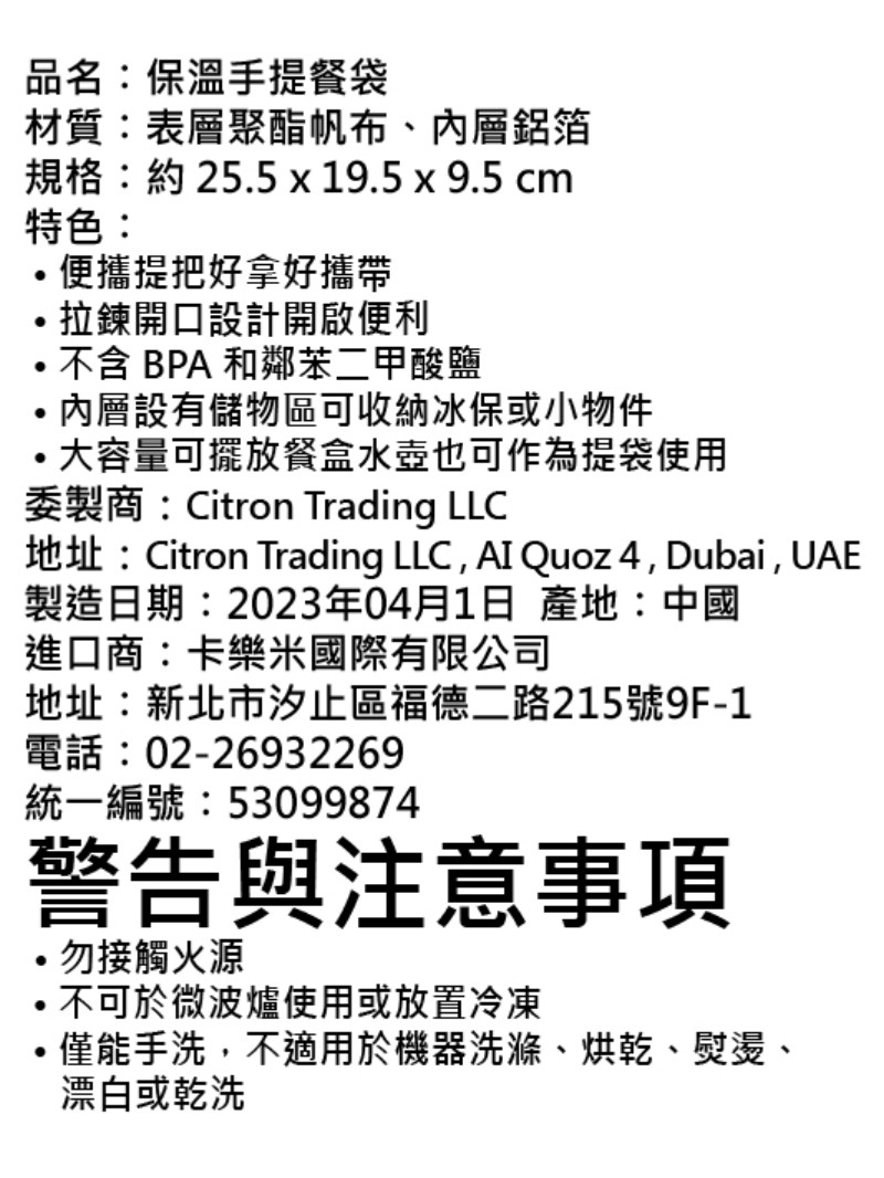 ✔聚酯帆布外層搭配恆溫鋁箔內層,保溫保冷效果極佳✔拉鍊開口設計開啟便利✔內層設有儲物區可收納冰保或小物件✔大容量可擺放餐盒水壺也可作為提袋使用✔便攜手柄好拿好攜帶✔使用軟布擦拭清潔✔不適用機器洗滌、烘乾、熨燙、漂白或乾洗