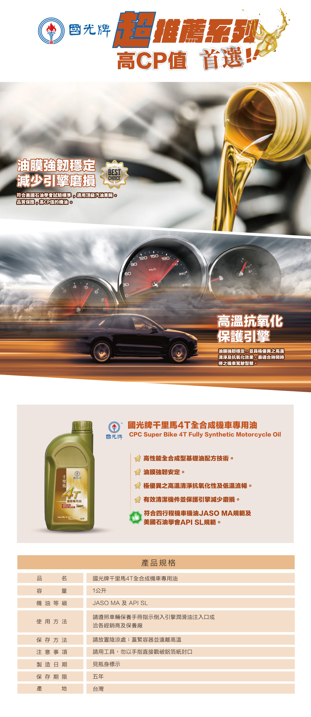 產品名稱:國光牌千里馬4T機車專用油10W/401L(全合成)