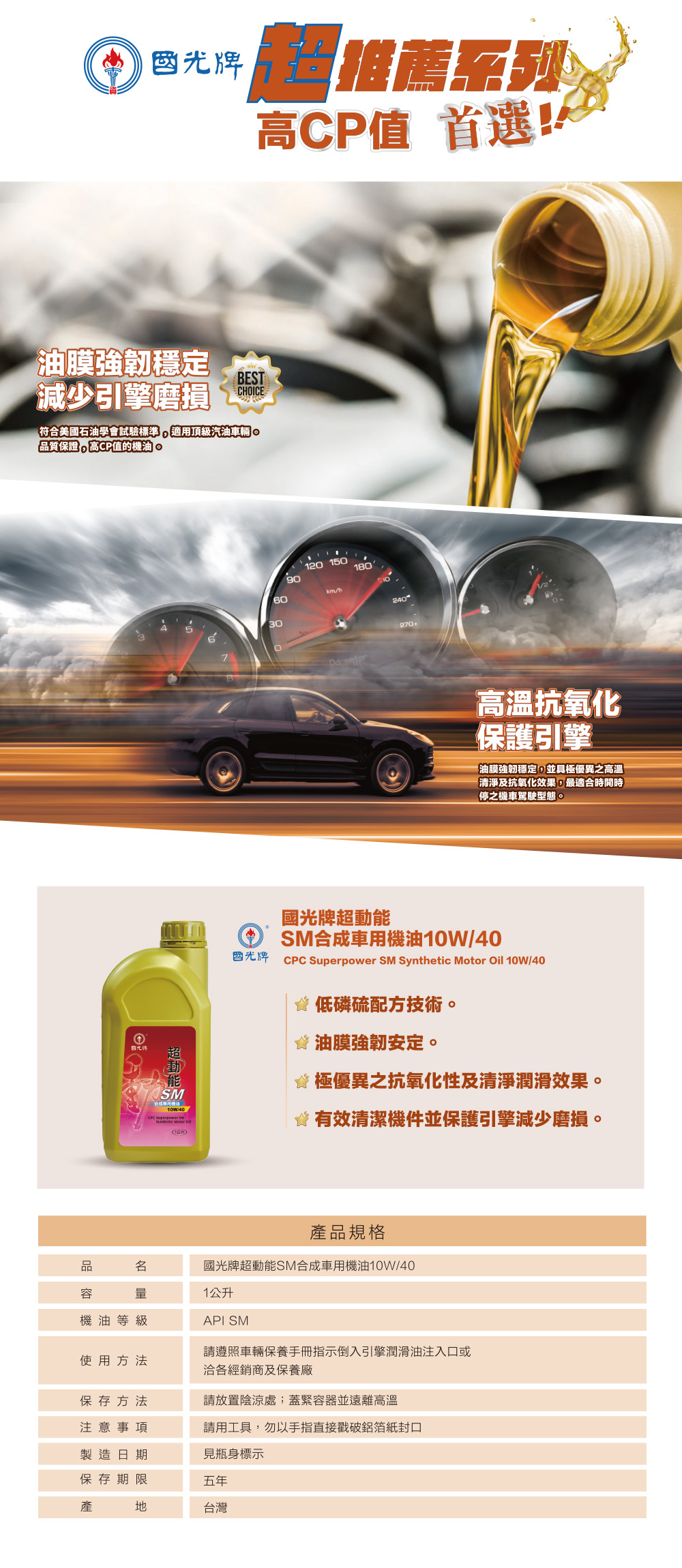 ●本產品符合美國石油學會API SM等級試驗標準,採用超高性能合成型基礎油及最新低磷硫配方技術,油膜強韌安定,並具極優異之抗氧化性及清淨潤滑效果,可有效清潔機件並保護引擎減少磨損,換油里程可適度延長