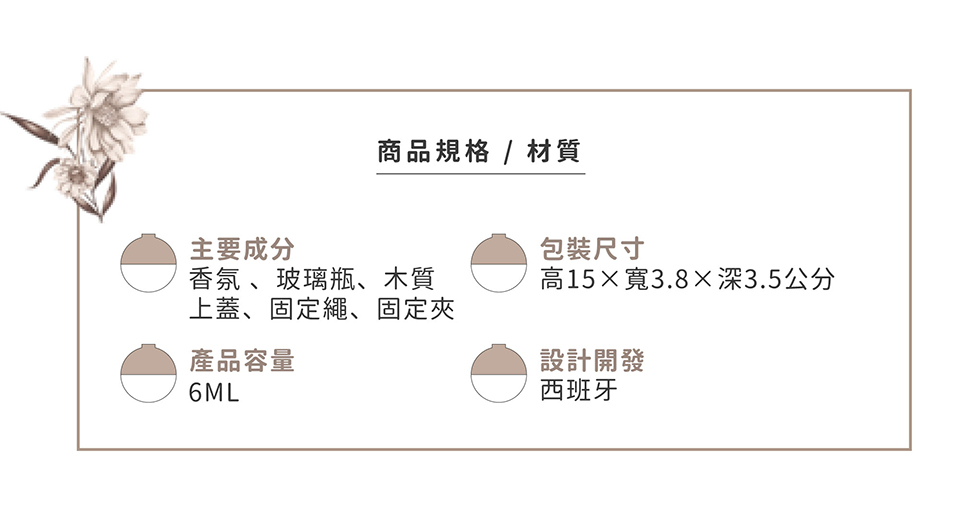 主要成分:香氛、玻璃、木質上蓋、固定繩、固定夾產品容量:6ML包裝尺寸:高15×寬3.8×深3.5公分設計開發:西班牙保存期限: 3年