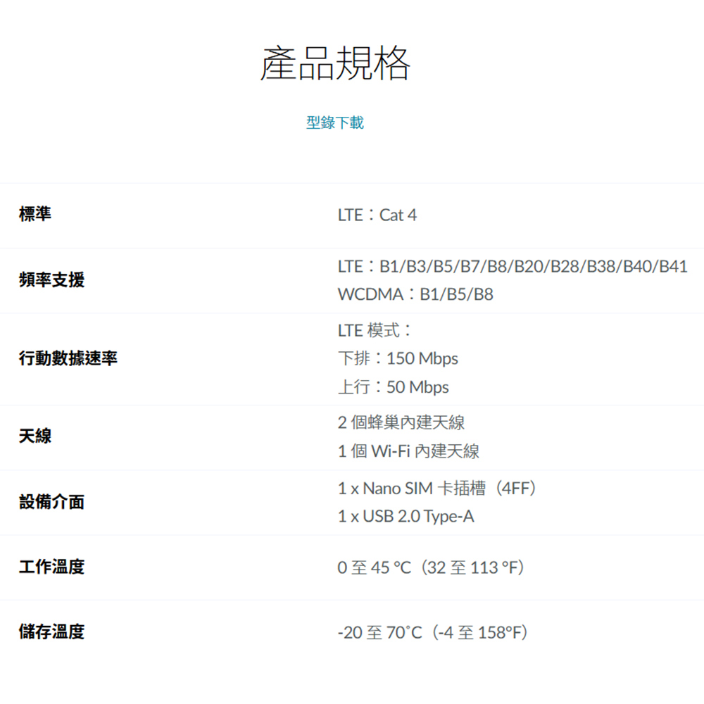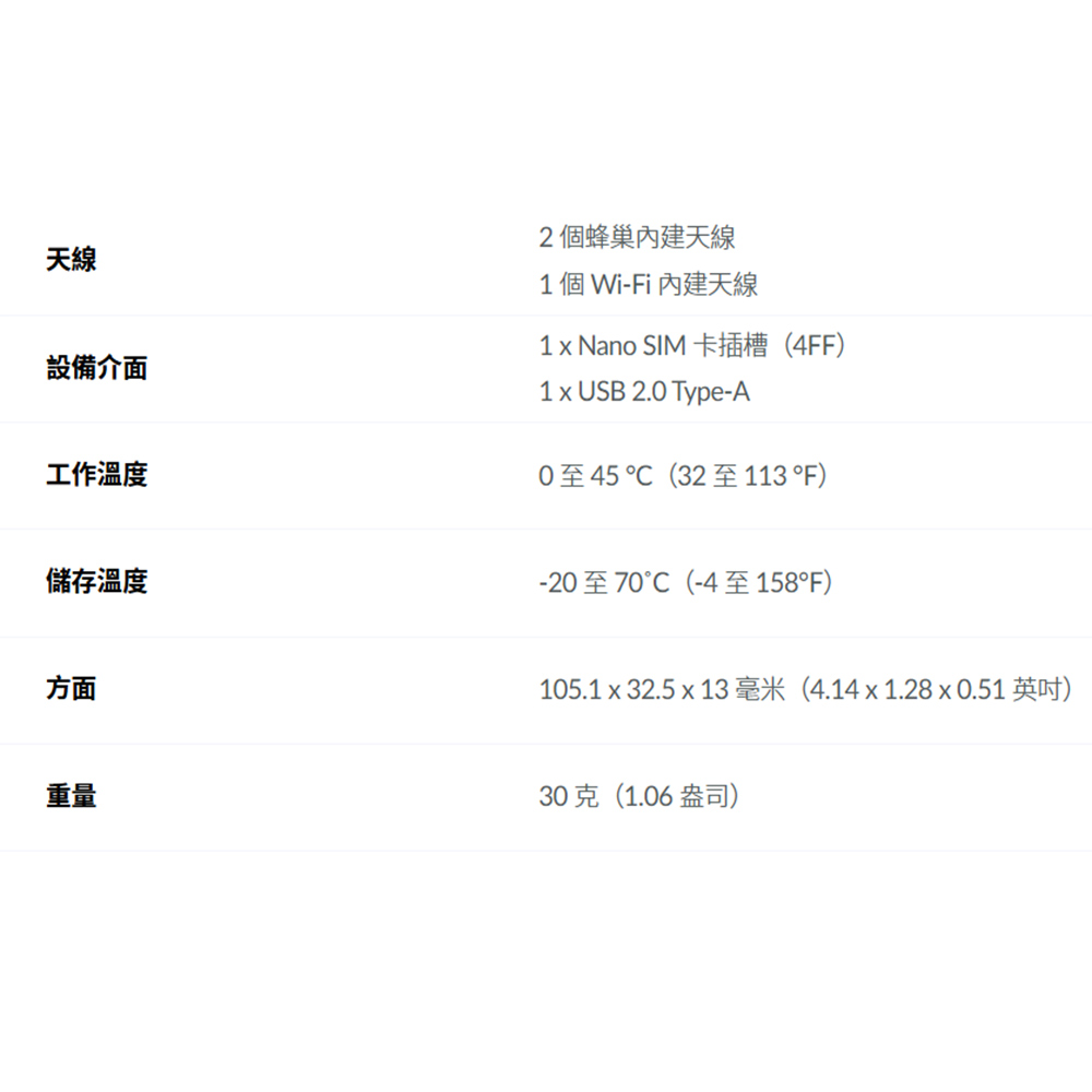 -4G LTE連線 : 支援Cat 4高速行動網路,下載速度高達150 Mbps,上傳速度高達50 Mbps。