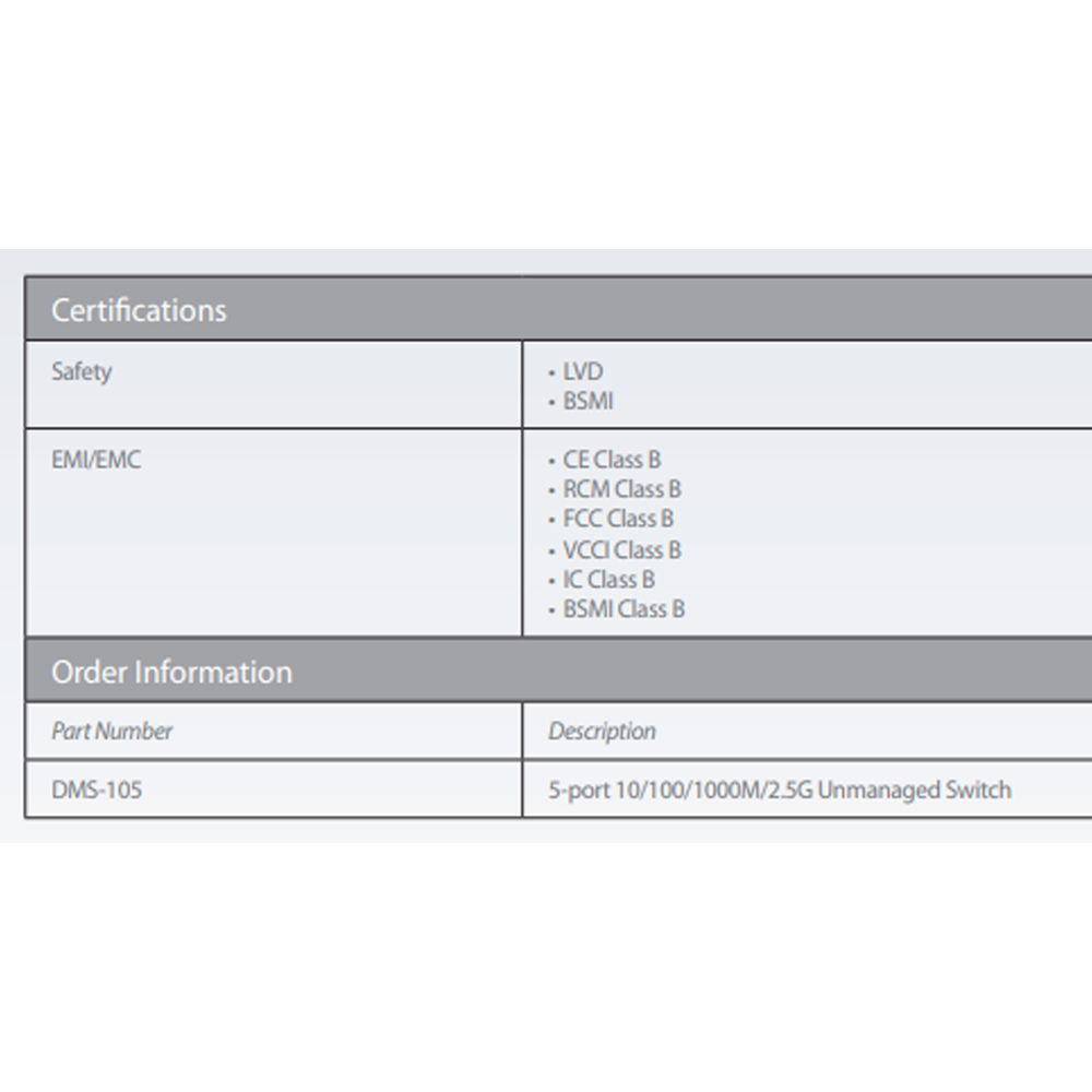 連接埠數量/介面5埠10/100Mbps/1G/2.5G BASE-T。 提供25Gbps交換背板頻寬、4K網路硬體位址數量(MAC Address)。 具LED顯示燈號,可顯示電源、連接、速度等狀態。 金屬外殼有助散熱、隨插即用方便上手。 無風扇靜音設計。 尺寸:100.5 x 82 x 28 mm,可壁掛;不可安裝19吋機架。 電源:外接式電源變壓器 (輸出:DC 12V/1A) 。 操作溫度:攝氏0to40°C。 符合BSMI,具BSMI DoC符合性聲明書。 軟體功能,支援IGMP Snooping(支援MOD)、802.3x Flow Control、802.1p QoS、802.3az Energy Efficiency Ethernet (EEE)節能標準。 支援IEEE 1905.1標準協議。