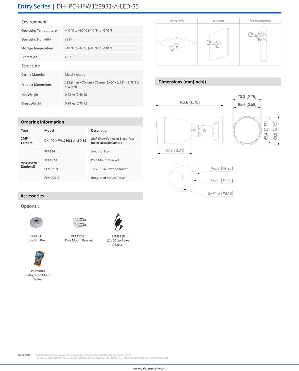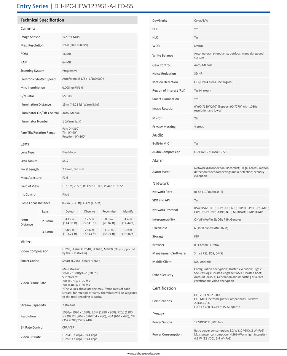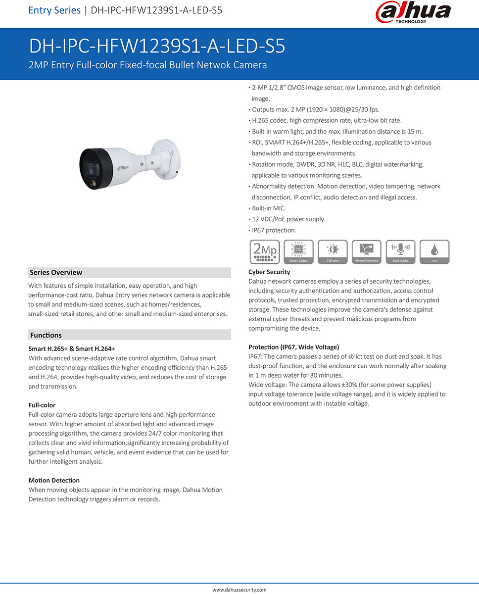 昌運監視器 大華 IPC-HFW1239S1-A-LED 2MP入門級全彩定焦槍式網路攝影機 IP67防護等級