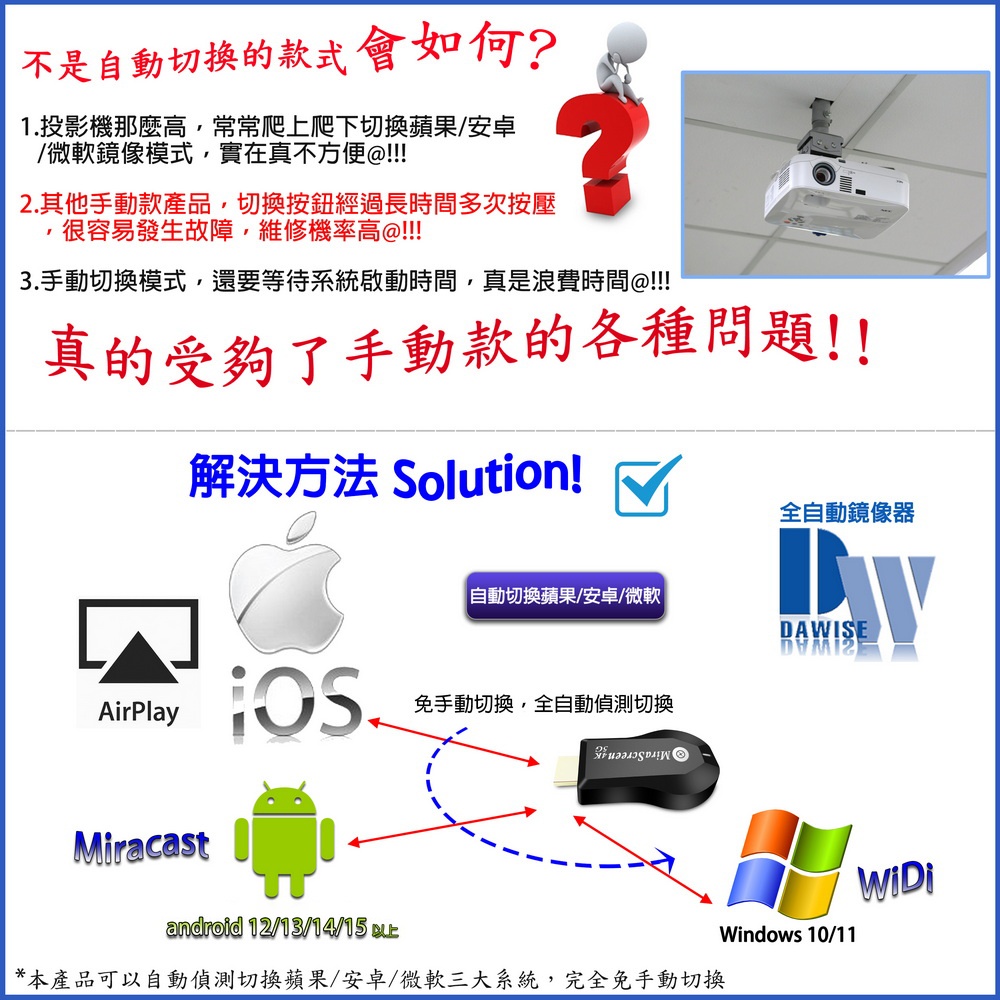 《商品特色》真正高畫質無線影音傳輸支持H.265高畫質無線投影操作簡單 影音投影■支援4K(3840×2160)超高清畫質■免安裝任何軟體■無線連結,影音同步分享■支援蘋果/安卓/電腦無線投影顯示■可電腦直接電視同步顯示■支持Airplay/Miracast/WIDI/DLNA影音同步傳輸模式《商品介紹》隨著智慧型裝置普及,手機、平板、電腦已成為日常不可或缺的工具。但螢幕太小往往影響學習與娛樂體驗。現在,只要一個 無線投影器,就能輕鬆將螢幕畫面同步到電視或投影機,大螢幕享受更清晰、更震撼!隨插即投:操作簡單,免驅動免APP。跨平台支援:支援 iOS / Android / Windows / Mac OS。高畫質輸出:清晰畫質 ,清晰不卡頓。穩定傳輸:低延遲設計,影音同步。輕巧便攜:出差、上課、居家,一機搞定。【應用場景】居家娛樂:追劇、看電影,大螢幕更沉浸。遊戲對戰:手機秒變遊戲主機,刺激加倍。教育教學:課堂同步投影,互動更生動。會議簡報:商務展示更專業,告別繁瑣連線。汽車導航:手機地圖投影到大螢幕,安全又直觀。《注意事項》1.如果要使用在汽車的螢幕投影,請先確認汽車是否有HDMI或AV影音輸入,請確認後再進行購買。2. 本商品是HDMI影音傳輸介面,如果是汽車是AV(黃白紅三色插孔)則需要另外自行準備HDMI轉AV的轉換器才可以使用。《商品配備》無線影音鏡像傳輸器 x1WiFi模組線x1說明書 x14大好禮: USB充電器x1 + HDMI傳輸線x1 + HDMI母對母轉接頭x1 + 手機支架x1《商品規格》廠牌: Dawise型號: 第10代WD65顏色: 黑支援的設備: 蘋果,安卓,微軟裝置支援影音同步傳輸模式: AirPlay/Miracast/DLNA/WIDIUSB供電(DC+5V)HDMI連接電視產地: 中國大陸產品保固: 主機保固3個月,配件/贈品保固1個月,保固範圍不包含人為損壞。《NCC認證字號》CCAJ14LP398ET5