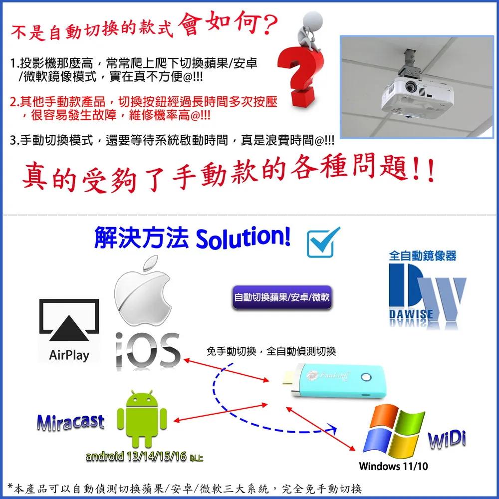 隨時隨地大螢幕娛樂操作簡單影音投影一機多用,教學娛樂導航全搞定免安裝任何軟體無線連結,影音同步分享支援蘋果/安卓/電腦無線投影可電腦直接電視同步顯示高畫質輸出,高速穩定傳輸《商品介紹》隨著智慧型裝置普及,手機、平板、電腦已成為日常不可或缺的工具。但螢幕太小往往影響學習與娛樂體驗。現在,只要一個 無線投影器,就能輕鬆將螢幕畫面同步到電視或投影機,大螢幕享受更清晰、更震撼!隨插即投:操作簡單,免驅動免APP。跨平台支援:支援 iOS / Android / Windows / Mac OS。高畫質輸出:支援 Full HD ,清晰不卡頓。穩定傳輸:低延遲設計,影音同步。輕巧便攜:出差、上課、居家,一機搞定。【應用場景】居家娛樂:追劇、看電影,大螢幕更沉浸。遊戲對戰:手機秒變遊戲主機,刺激加倍。教育教學:課堂同步投影,互動更生動。會議簡報:商務展示更專業,告別繁瑣連線。汽車導航:手機地圖投影到大螢幕,安全又直觀。《注意事項》1.如果要使用在汽車的螢幕投影,請先確認汽車是否有HDMI或AV影音輸入,請確認後再進行購買。2. 本商品是HDMI影音傳輸介面,如果是汽車是AV(黃白紅三色插孔)則需要另外自行準備HDMI轉AV的轉換器才可以使用。《商品配備》無線影音鏡像傳輸器 x1說明書 x14大好禮: USB充電器x1 + USB供電線x1 + HDMI延長線x1 + 手機支架或指環扣(隨機出貨)《商品規格》廠牌: Dawise型號: 九代WD36顏色: 青綠支援的設備: 蘋果,安卓,微軟裝置支援影音同步傳輸模式: AirPlay/Miracast/DLNA/WIDIUSB供電(DC+5V)HDMI連接電視產地: 中國大陸產品保固: 主機保固3個月,配件/贈品保固1個月,保固範圍不包含人為損壞。《NCC認證字號》CCAJ15LP0824T0