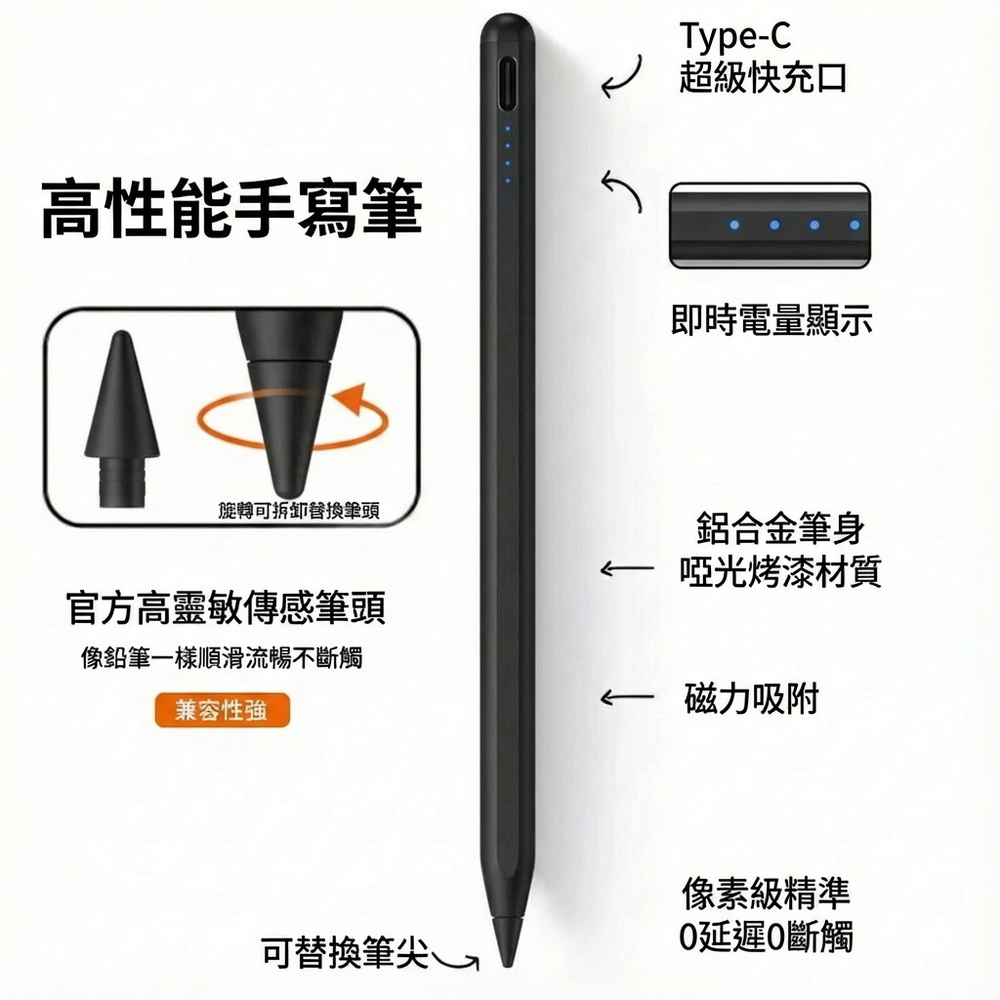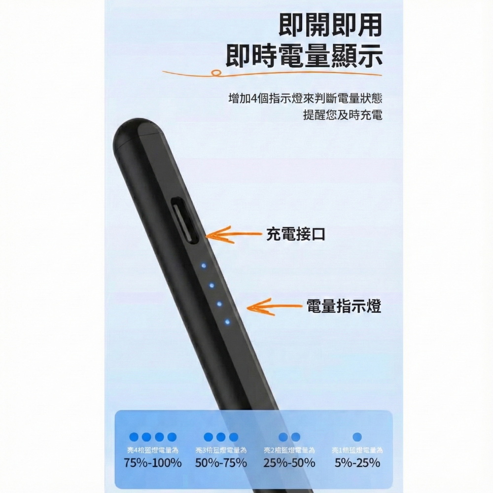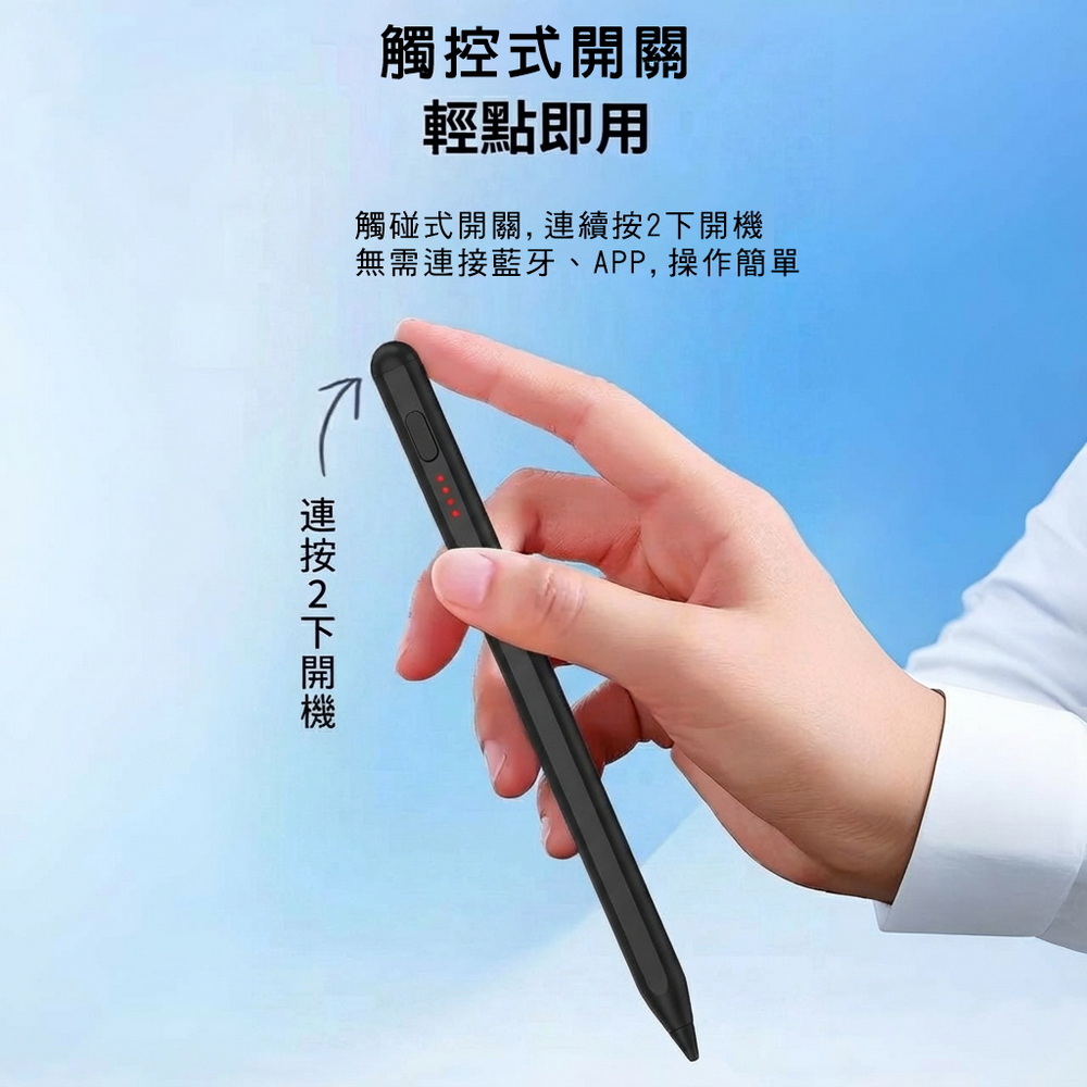 《商品介紹》攜帶方便,隨意書寫想畫就畫,想寫就寫免裝軟體,無需藍芽配對■書寫/塗鴉/繪圖最佳利器■順滑好書寫■好握好寫,攜帶方便■內建鋰電池充電設計■方便隨身攜帶1. 適用各款電容式觸控螢幕的手機或平板。2. 安卓/蘋果/微軟系統的手機或平板都適用。3. 精密耐用纖維觸控筆頭,穩定/耐用/實用。4. 操作快速簡易,隨拿即用5. 不需搭配APP或是藍芽使用。6. 觸控位置精準,書寫非常流暢7. 本商品不是”蘋果Apple Pencil”,也與”蘋果Apple Pencil”功能不同,請確認後再購買。《注意事項》這是通用款觸控筆,適用安卓/蘋果/微軟系統的手機或平板,但沒有防誤觸功能,請先確認後再購買