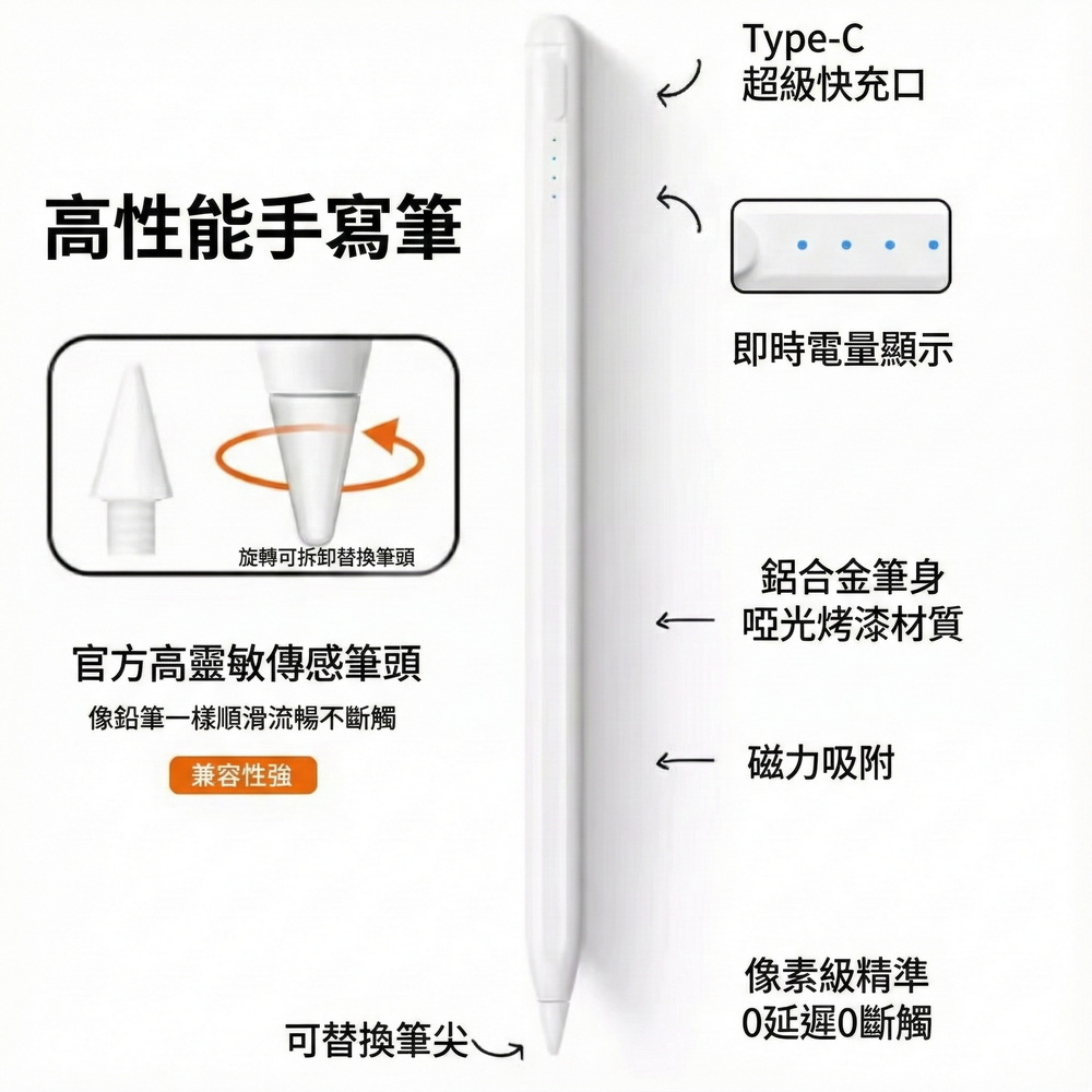 《商品介紹》攜帶方便,隨意書寫想畫就畫,想寫就寫免裝軟體,無需藍芽配對■書寫/塗鴉/繪圖最佳利器■順滑好書寫■好握好寫,攜帶方便■內建鋰電池充電設計■方便隨身攜帶1. 精密耐用纖維觸控筆頭,穩定/耐用/實用。2. 操作快速簡易,隨拿即用3. 不需搭配APP或是藍芽使用。4. 觸控位置精準,書寫非常流暢5. 本商品不是”蘋果Apple Pencil”,也與”蘋果Apple Pencil”功能不同,請確認後再購買。《注意事項》這是iPad專用觸控筆,只適用ipad及ipad mini,請先確認後再購買