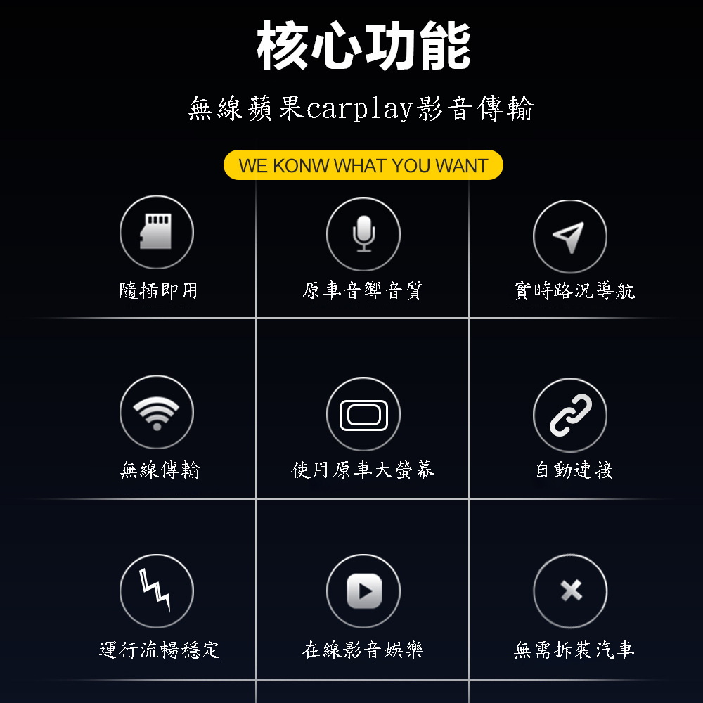 《商品介紹》行車影音真享樂汽車大螢幕導航更便利行車免持通話更便利更安全不需下載任何APP,隨插即用手機無線傳輸到汽車大螢幕及高傳真音響高速無線傳輸,影音不延遲免拆機改車,操作安裝簡單,隨插即用不需下載任何APP,隨插即用蘋果手機影音無線傳輸到汽車高速無線傳輸,影音不延遲將汽車有線的carplay轉變成無線carplay完全不需要改裝汽車,操作簡單只需一次簡單設定,以後上車就自動連接支援google地圖,蘋果地圖或其他第三方手機導航地圖傳輸到汽車大螢幕可將手機音樂,youtube音樂,或其他APP音樂傳輸到汽車高傳真音響行車免持通話更便利更安全《注意事項》1.本商品只適用蘋果iphone/ipad,無法使用安卓手機。2.汽車本身需有內建有線USB插孔的carplay功能,才可以使用。3.因為行車安全的相關法令及考量,會限制播放視頻影片(但可以播放音樂),保護駕駛行車安全