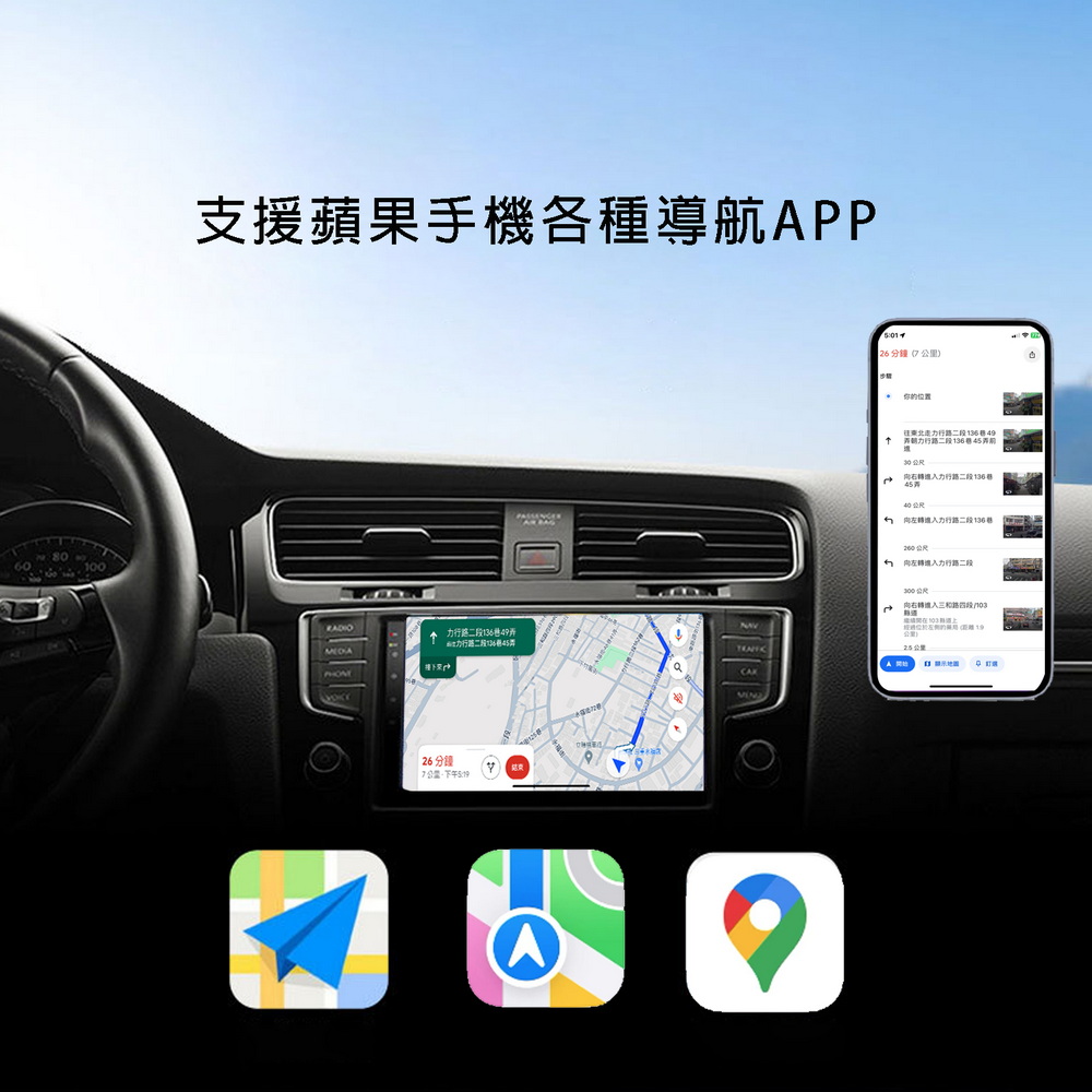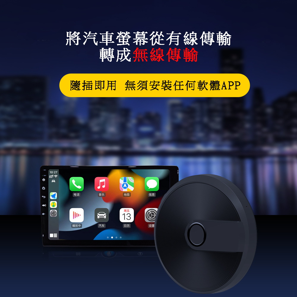 《商品介紹》行車影音真享樂汽車大螢幕導航更便利行車免持通話更便利更安全不需下載任何APP,隨插即用手機無線傳輸到汽車大螢幕及高傳真音響高速無線傳輸,影音不延遲免拆機改車,操作安裝簡單,隨插即用不需下載任何APP,隨插即用蘋果手機影音無線傳輸到汽車高速無線傳輸,影音不延遲將汽車有線的carplay轉變成無線carplay完全不需要改裝汽車,操作簡單只需一次簡單設定,以後上車就自動連接支援google地圖,蘋果地圖或其他第三方手機導航地圖傳輸到汽車大螢幕可將手機音樂,youtube音樂,或其他APP音樂傳輸到汽車高傳真音響行車免持通話更便利更安全《注意事項》1.本商品只適用蘋果iphone/ipad,無法使用安卓手機。2.汽車本身需有內建有線USB插孔的carplay功能,才可以使用。3.因為行車安全的相關法令及考量,會限制播放視頻影片(但可以播放音樂),保護駕駛行車安全
