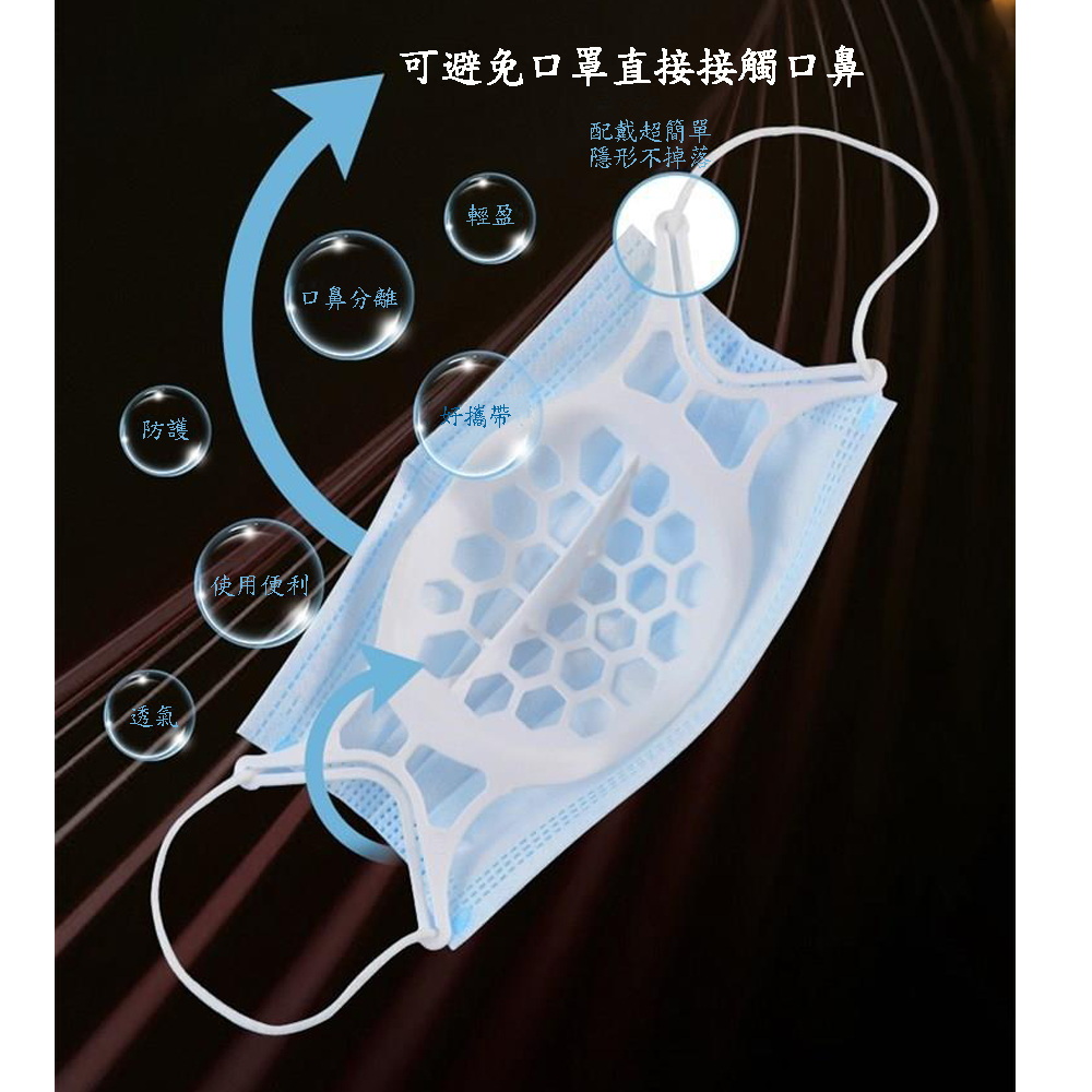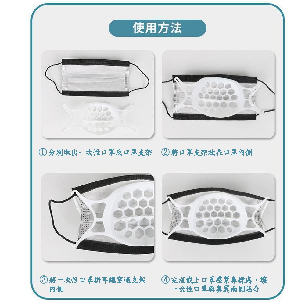《商品介紹》搭配口罩的最佳神器解決長時間配戴口罩的困擾立體支撐 空氣流通更舒適人體工學設計 3D立體支撐• 適合不同臉型使用• 減少直接接觸口罩 增加安全• 使用便利 簡易扣掛• 舒適 透氣 清爽• 可水洗重複使用《注意事項》1. 本商品不含口罩,商品主體是口罩支架2. 本商品是屬於衛生用品類,商品拆封後,不再享有退貨服務。