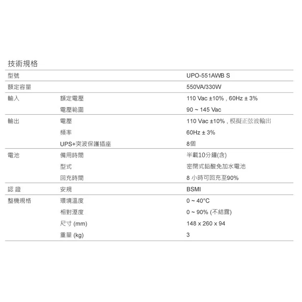 昌運監視器 DELTA台達電子 UPS不斷電系統 UPO-551AWB-S OFF-LINE離線式 550VA 110V 突波保護插座