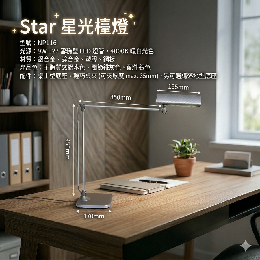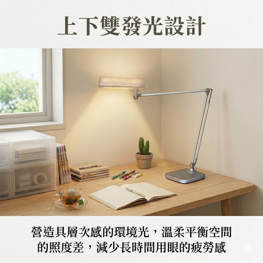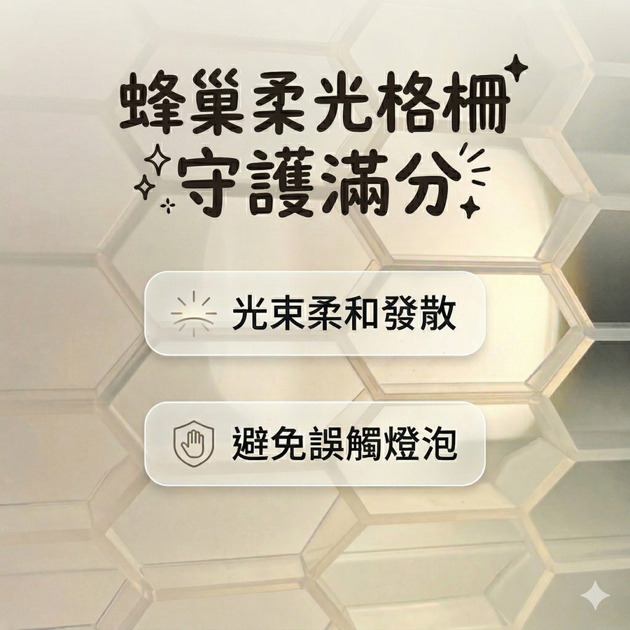 向上投射星光點點,美翻天向下投射均勻照明,舒適護眼上下發光效率極大化並平衡照度差經典雙臂支架,好拉好折好實用蜂巢柔光格柵,避免誤觸燈泡,好貼心使用E27 LED 燈管,自己更換好輕鬆
