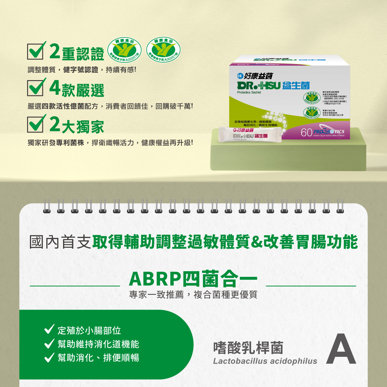 DR.HSU好康益生菌為首支獲得國家小綠人健康食品認證,輔助調整過敏體質、胃腸功能改善,雙效認證DR.HSU好康益生菌由首位發現本土菌株「LP菌」的臺灣益生菌之父-許庭源醫師與生技女王-呂春美博士率領生技團隊開發各種適合國人體質的機能性益生菌,為國內業界最多本土專利菌株的領導品牌!商品特色•首支獲得國家小綠人健康食品認證,具輔助調整過敏體質功能、胃腸功能改善雙效認證•嚴選四款活性益菌配方,出廠菌數100億活菌數•通過SGS檢驗認證合格!不含塑化劑、西藥、重金屬•專為台灣人體質設計!醫師團隊獨家研發生產專利菌株•生產工廠通過國際多項認證保障品質,台灣製造自產自銷新鮮直送常見問題Q1.幾歲可以開始吃好康益菌(益生菌)?3歲以上一天1包,加強保養一天2包。 Q2.無法直接吃好康益菌(益生菌)可以怎麼做?可以將益生菌粉末倒入常溫水、果汁或牛奶(請沖泡完後再將益生菌加入)並於當天喝完,注意溫度勿超過45度C,避免影響益生菌活性。 Q3.好康益菌(益生菌)的最佳食用時間?早上空腹及睡前30分鐘是最佳時間,活性益生菌需腸道定殖才能發揮功能,晚上睡覺時是腸道最穩定的狀態,因此睡前與白天起床空腹時食用效果最好。如果腸胃功能欠佳,建議調整為就餐時或飯後立刻食用。※空腹定義為胃排空的狀態下,例如飯前1小時或飯後2小時,空腹期可以喝水。 Q4.吃好康益菌(益生菌)是否有藥物或食物的禁忌?避免與高油脂(油炸)食物、刺激性飲料(含咖啡因/碳酸/酒精)、中(西)藥及抑菌藥物共同食用,並請間隔一小時以上再食用益生菌。※營養保健品(維生素B/鈣/膠原蛋白...等) 可安心同時食用 Q5好康益菌(益生菌)需要冷藏保存嗎?好康益菌是活菌,經凍晶乾燥處理,短時間內可放置常溫,請避開潮濕及陽光直曬的環境即可。為了讓活菌的活性維持最佳狀態,長期存放則建議冷藏保存。 Q6.好康益菌(益生菌)需要吃多久才會明顯有效呢?益生菌在腸道建立優勢菌種時間過程約需3個月,效果明顯感覺會依照每人狀況的不同而異,想要輔助調整過敏體質最快是 4週,胃腸功能改善和排便順暢最快是2~3週,為了使益生菌效果發揮到最大,必須定期食用,不可間隔太久,避免好菌流失,吃愈久功效就愈佳唷! Q7.吃益生菌的菌數要多少才有效?維持消化道健康,每天1-2億的益生菌菌數即可;如果是調節生理機能,每天至少要20億菌數,對於調整過敏體質,每天需100億以上菌數是最有效。如攝取超過300億並不會更有效,因為腸道空間有限,多餘的菌反而會被排出體外唷!本蝦皮賣場為DR.HSU官方旗艦店//由原廠低溫宅配出貨.請您安心選購