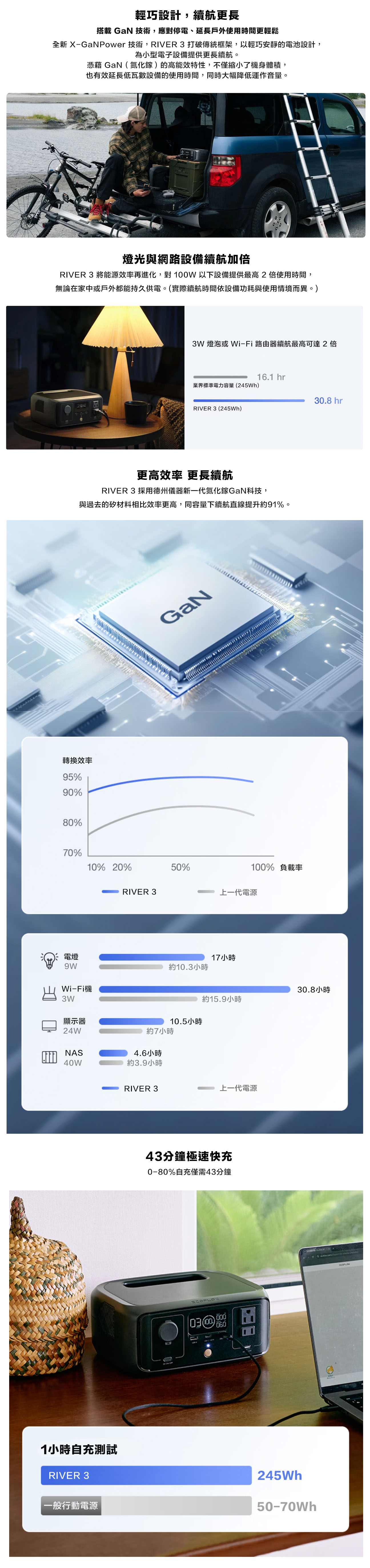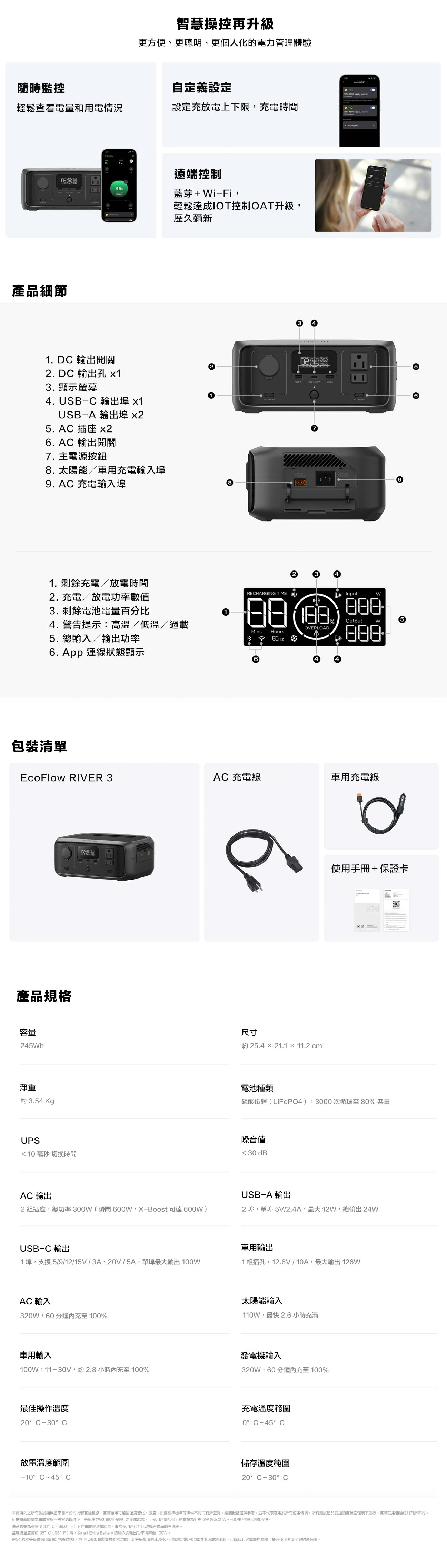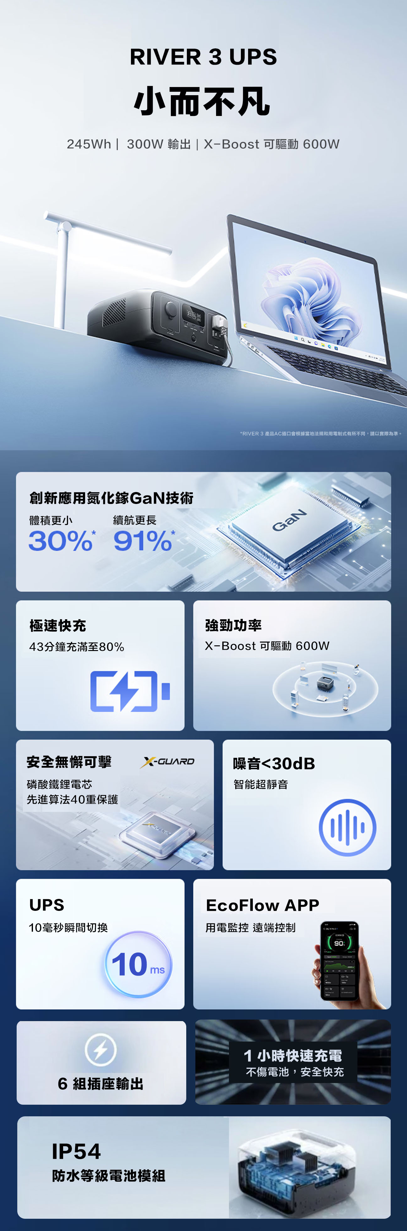 • 245Wh 電池容量,300W 額定輸出,X-Boost 可達 600W• 低瓦數設備可達 2 倍使用時間(實際使用時間視設備功耗與使用情境而異。)• 比業界平均體積小 30%• 小於 10 毫秒的 UPS 快速切換,提供不中斷備援電力• 小於 30 分貝超靜音運作,全天候安心使用• 1 小時快充,不卡電、不傷電池• IP54 防水等級電池模組,戶外也安心• 最多可同時為 6 台設備供電• 原廠提供 2 年保固• NCC認證字號:CCAF24Y10420T3• BSMI認證字號:R3H106
