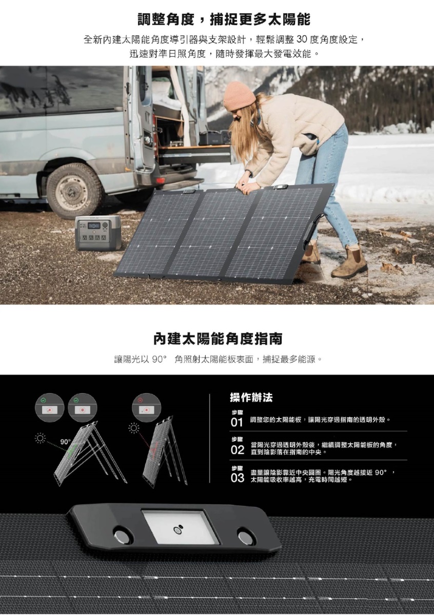 • 30–60° 可調式角度支架,內建太陽能角度導引器