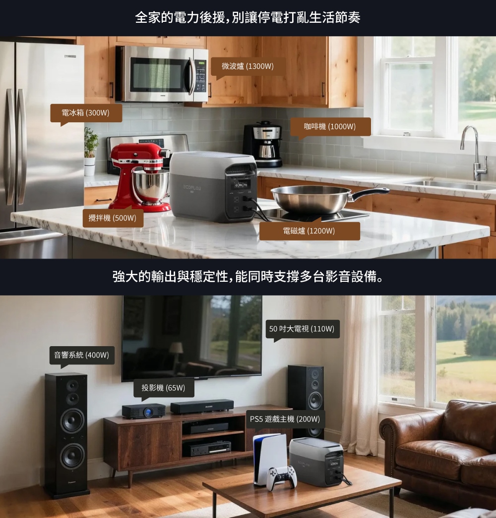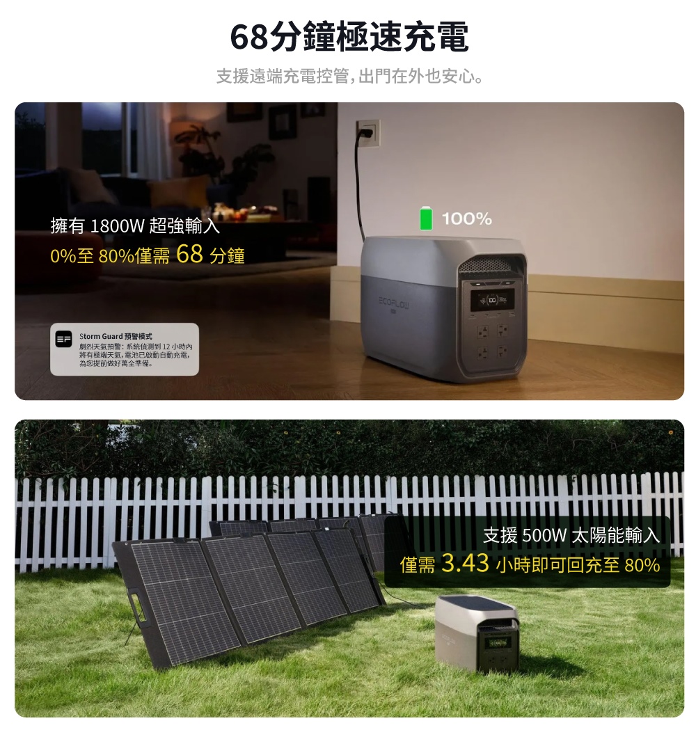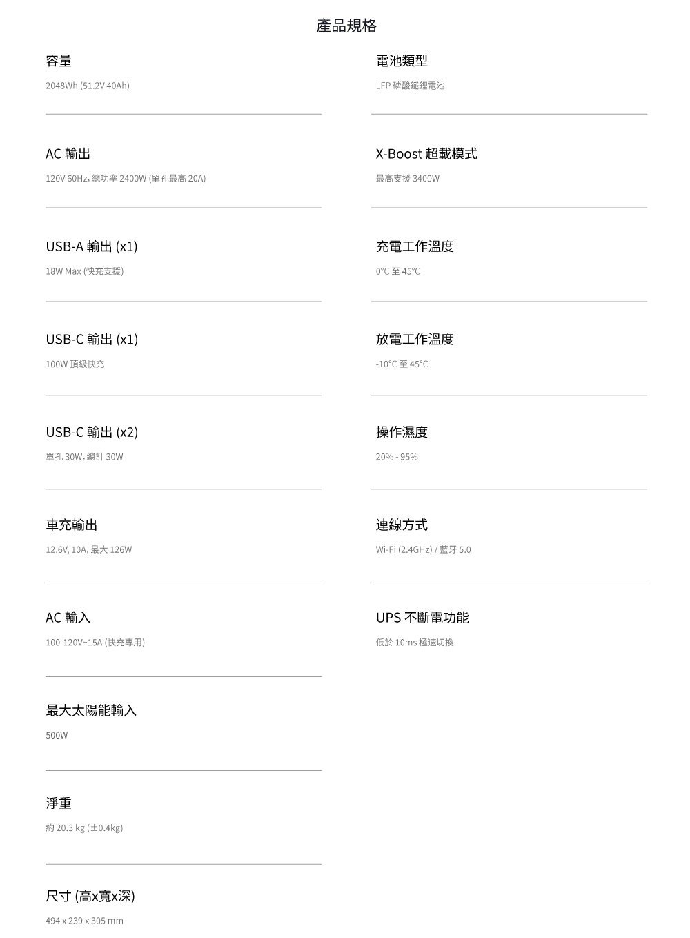 • 電池容量2度(2048Wh),僅20.3公斤,比上一代減輕13%• 2400W額定輸出,X-Boost模式可提供高達3400W的輸出功率• 68分鐘就能從0充到80%,多達4種快充模式• 採用車用LFP電池,循環壽命長達10年,搭配BMS電池管理系統與EV級CTC結構,耐震防摔• 可運行99%的家用電器• 10ms專業級不斷電切換,OASIS 3.0智慧即時監控• 運作噪音低於25dB(600W負載下)• 保固五年• BSMI認證字號:R3H106(型式EF-DL-H02-3M)• NCC字號:CCAH25LPC440T2
