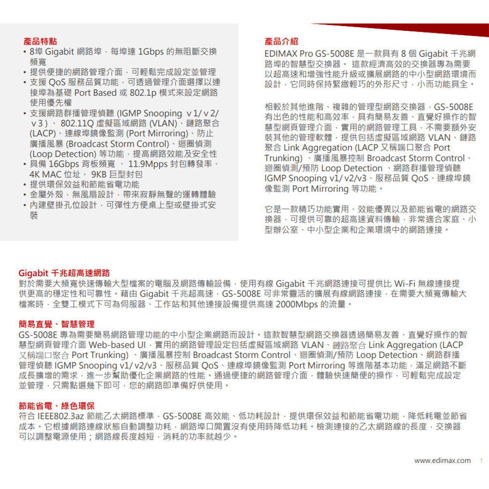 昌運監視器 EDIMAX 訊舟 GS-5008E (MIT) 8埠 Gigabit 智慧型網路交換器