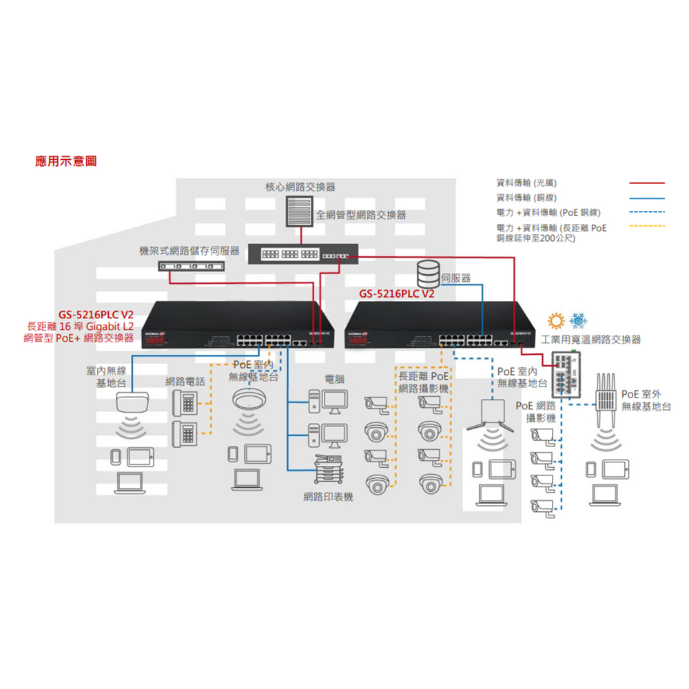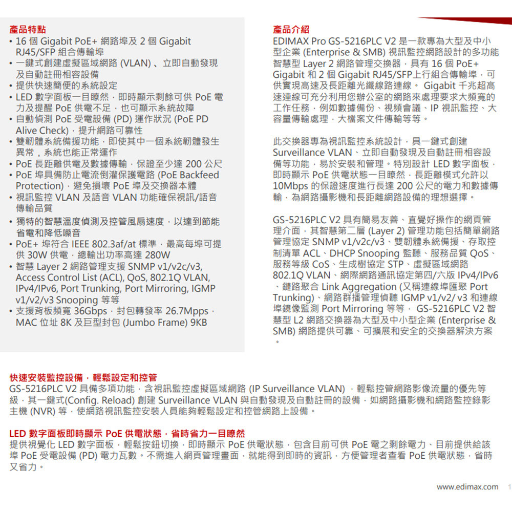 -16個Gigabit PoE+網路埠、2個Gigabit RJ45/SFP組合傳輸埠。